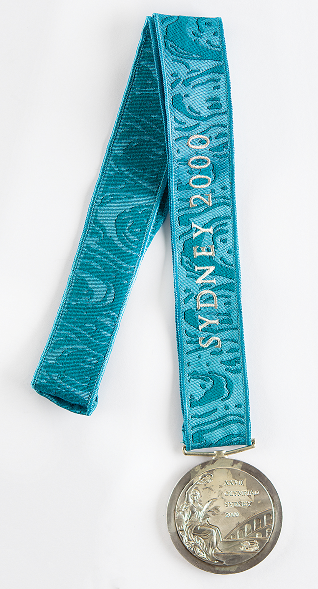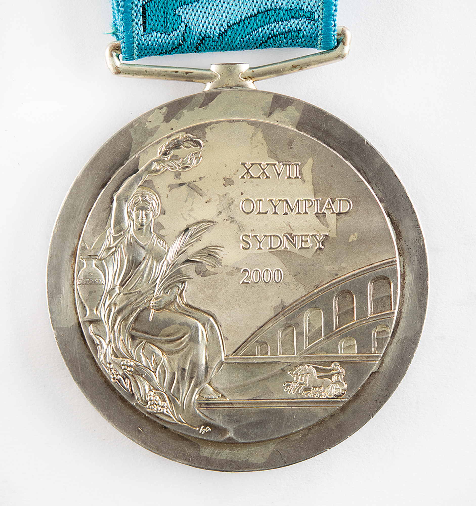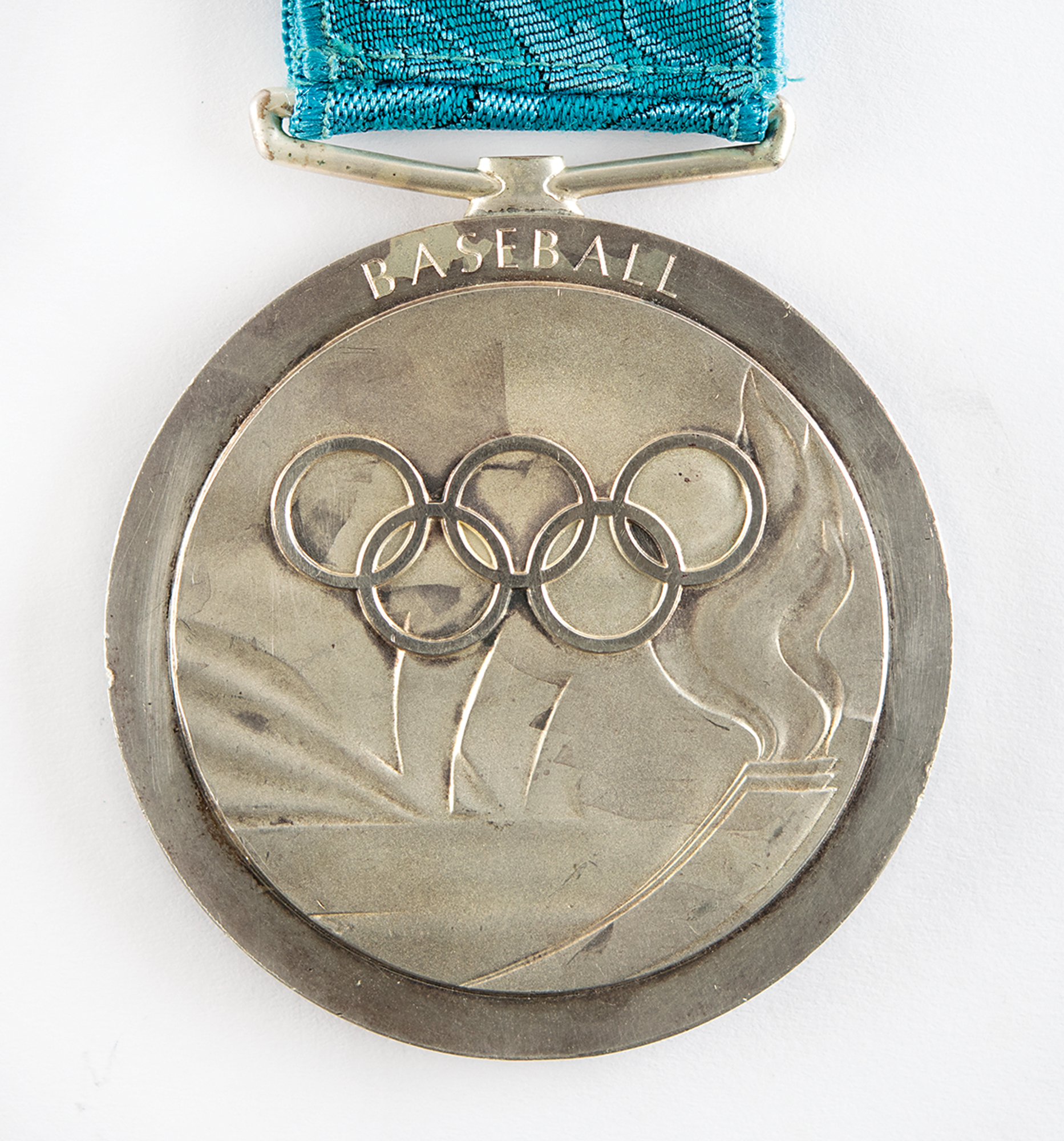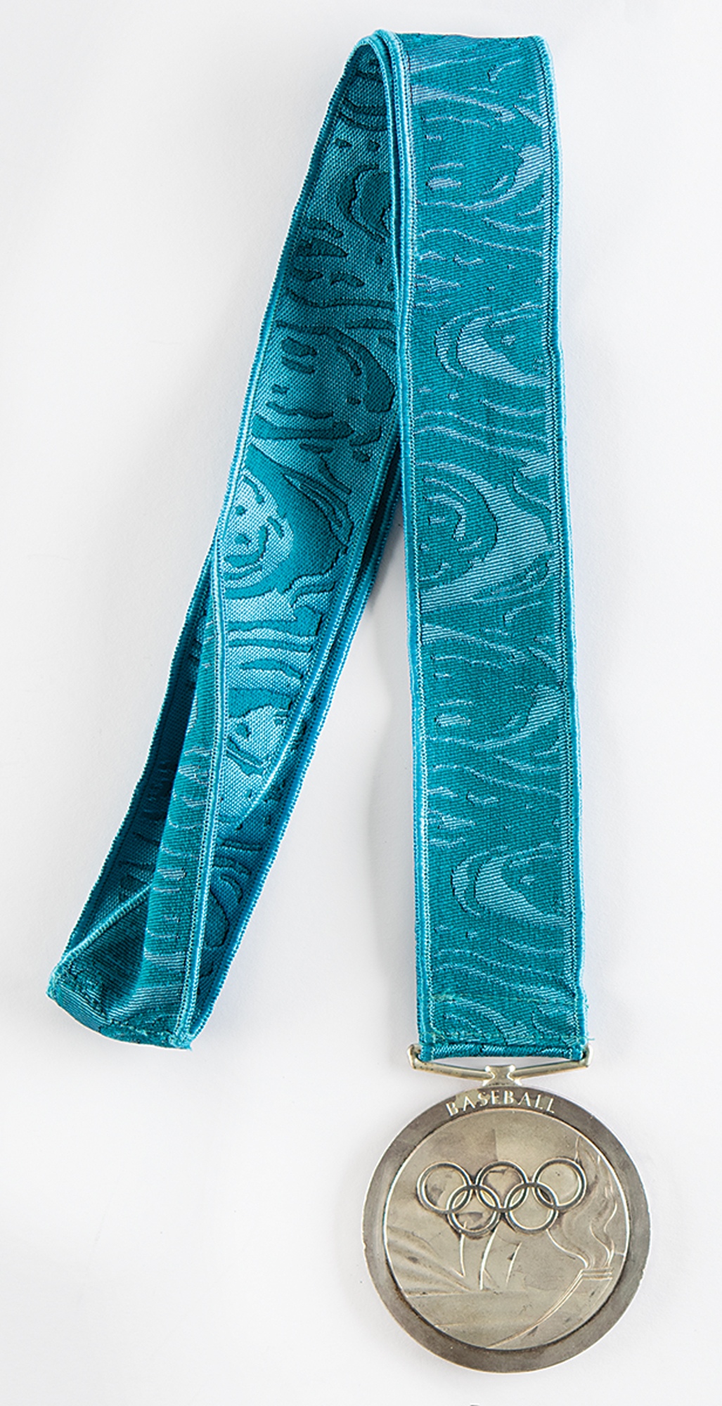 Rare winner's medal issued for a Cuban baseball player at the Sydney 2000 Summer Olympics. Silver, 68 mm, 185 gm, by Wojciech Pietranik and Brian Thompson; manufactured by the Royal Australian Mint. The front depicts a 'Seated Victory' with the Colosseum in the background; the reverse portrays the Olympic rings over the iconic Sydney Opera House, with the Sydney Olympic torch at right, inscribed above, "Baseball." The front and reverse bear uneven toning that is typical of Sydney silver winner's medals. Complete with the original blue ribbon embroidered in silver with the legend, "Sydney 2000."