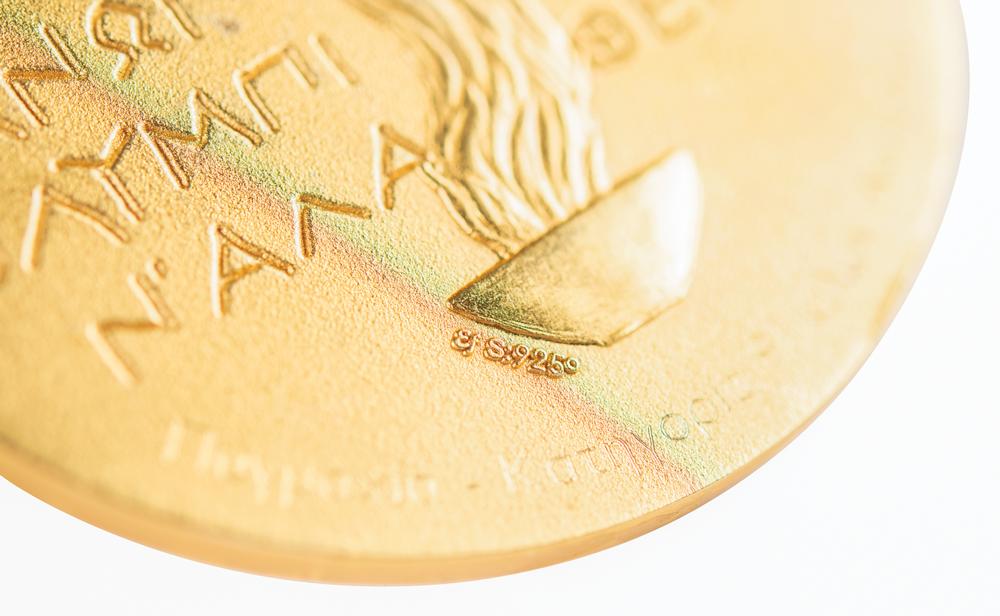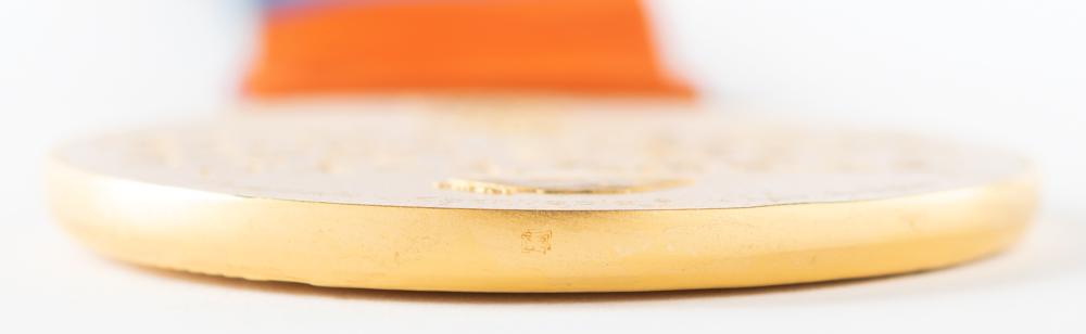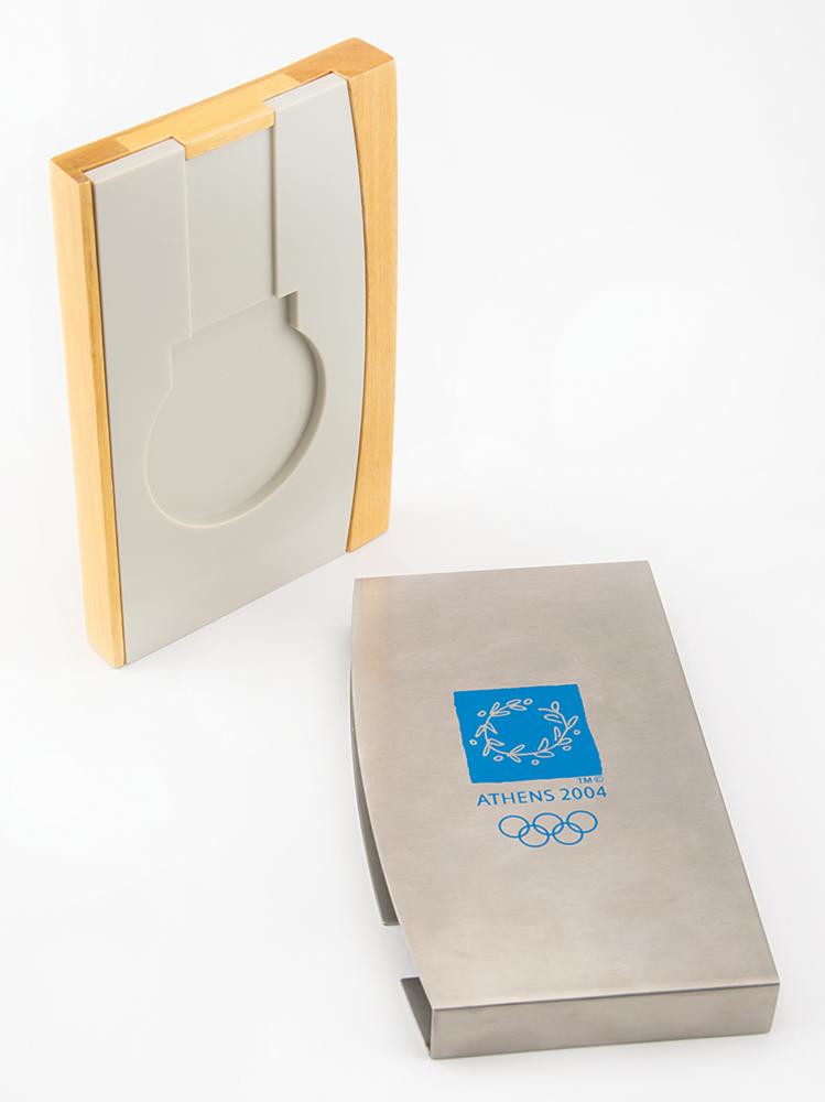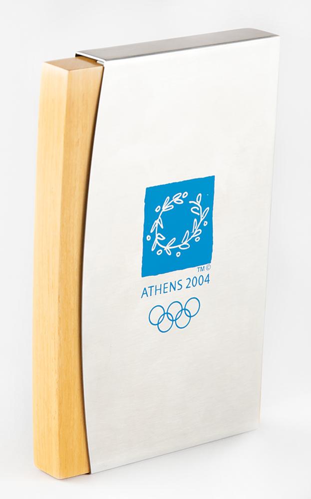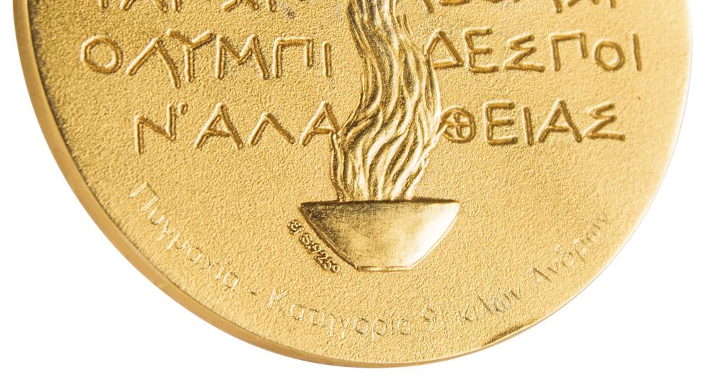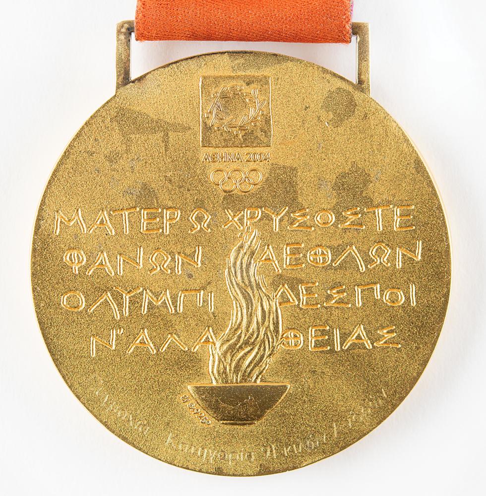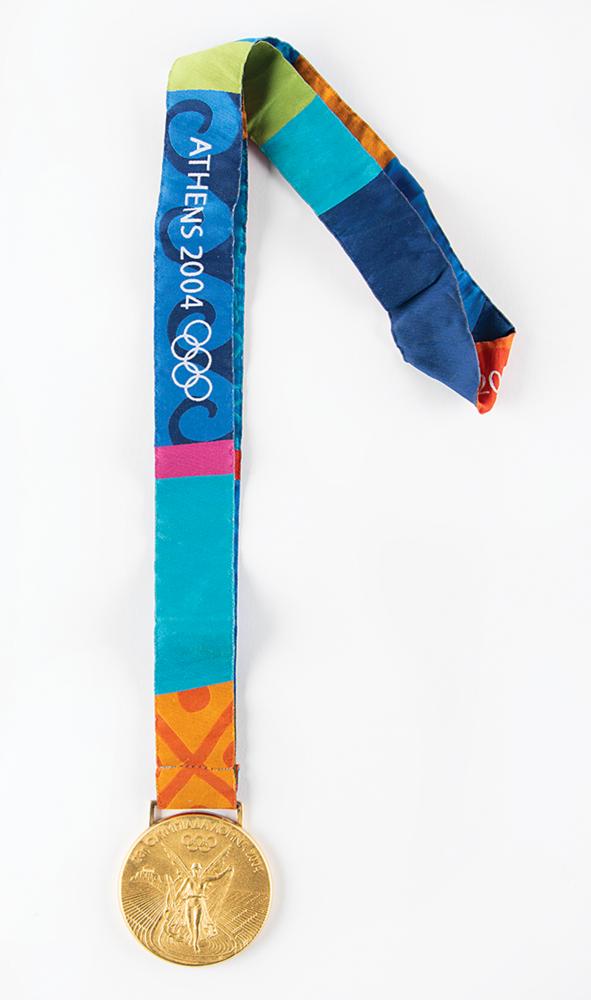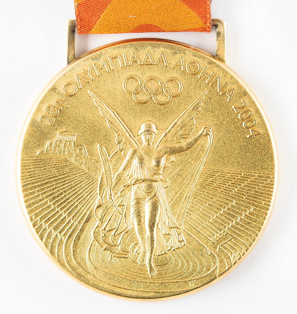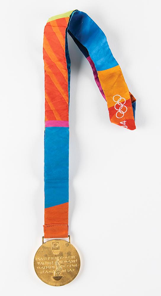Stunning winner’s medal awarded Cuban heavyweight boxer Odlanier Solís at the Athens 2004 Summer Olympics. Gilt silver, 61 mm, 147 gm, by Elena Votsi and Kostas Kazakos. The front depicts the winged goddess of Victory soaring into the Panathinaikos Stadium, with Greek characters and Olympic rings above; the reverse features the Eternal Flame of Olympia, the opening lines of Pindar's Eighth Olympic Ode, and the 2004 Summer Games logo, with the sport engraved in Greek lettering along the bottom, “Πυγμαχία - Κατηγορία 91 κιλών Ανδρων [Boxing, Men's 91 kg Category].” Completed by the original multicolored ribbon and wooden presentation box with metal slipcase. The 2004 Athens winner’s medals replaced the long-held ‘seated Victory’ design by Giuseppe Cassioli, rectifying the mistake of using a depiction of the Roman Colosseum rather than a Greek venue.