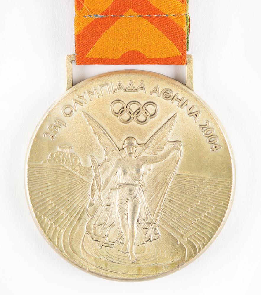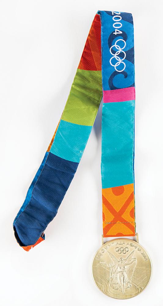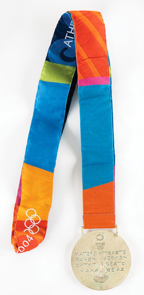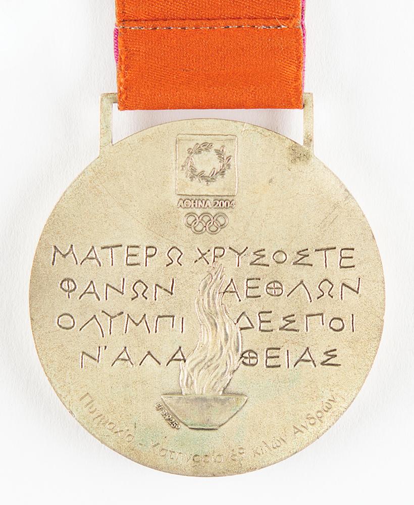 Winner’s medal awarded to Cuban welterweight boxer Lorenzo Aragon at the Athens 2004 Summer Olympics. Silver, 60 mm, 139 gm, by Elena Votsi and Kostas Kazakos; manufactured by Efsimon. The front depicts the winged goddess of Victory soaring into the Panathinaikos Stadium, with Greek characters and Olympic rings above; the reverse features the Eternal Flame of Olympia, the opening lines of Pindar's Eighth Olympic Ode, and the 2004 Summer Games logo, with the sport engraved in Greek lettering along the bottom, “Πυγμαχία - Κατηγορία 69 κιλών Ανδρων [Boxing, Men's 69 kg Category].” Completed by the original multicolored ribbon. The 2004 Athens winner’s medals replaced the long-held ‘seated Victory’ design by Giuseppe Cassioli, rectifying the mistake of using a depiction of the Roman Colosseum rather than a Greek venue.