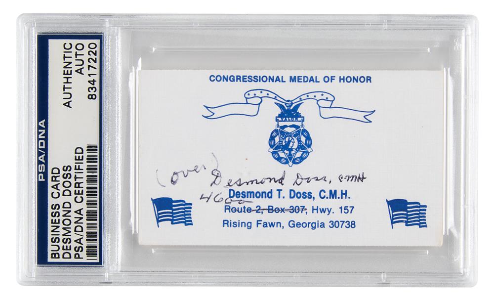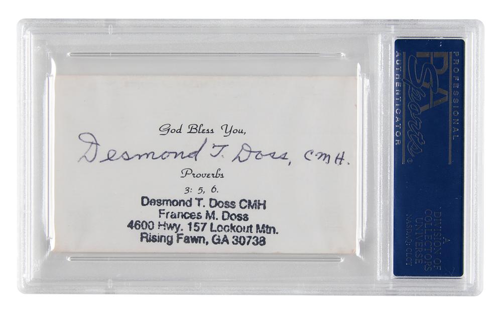 Personal “Congressional Medal of Honor” business card belonging to Desmond Doss, 3.5 x 2, signed on the front in black ballpoint, “Desmond Doss, CMH,” who corrects the address below and then signs again on the reverse, “Desmond T. Doss, CMH.” In fine condition. ​​Encapsulated in a PSA/DNA authentication holder.