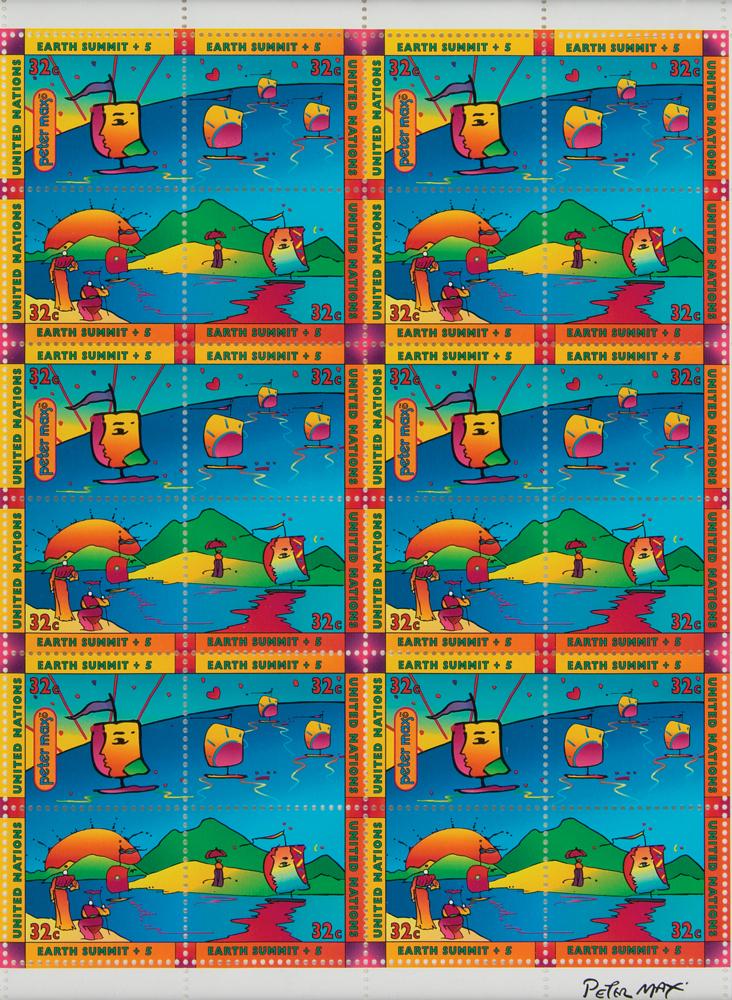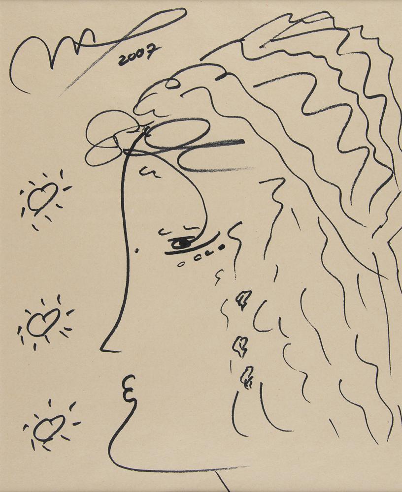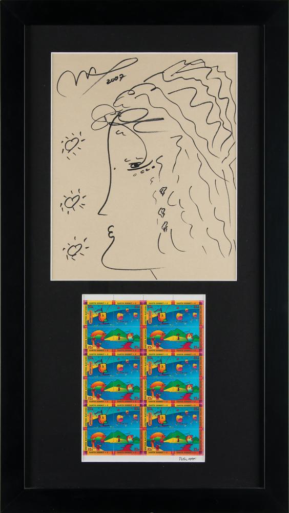 Uncommon original sketch of a woman's face in profile by Peter Max, accomplished in felt tip on an off-white 8.75 x 10.75 sheet, signed in the upper left, "Max, 2007." Attractively matted and framed with a block of Max-designed stamps to an overall size of 13.75 x 24.25. In very fine condition. Accompanied by a certificate of authenticity from PSA/DNA. An appealing and larger-than-typically-seen sketch from the famed pop artist.
