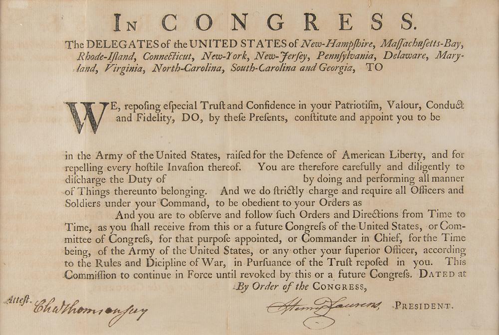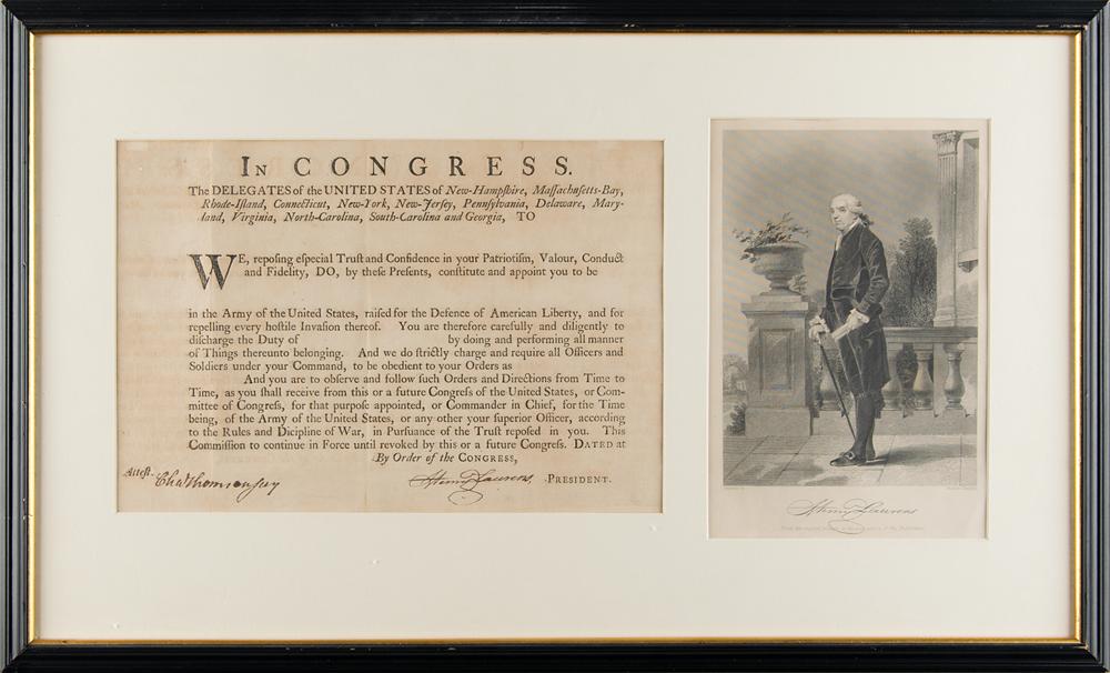 Important South Carolina statesman (1724-1792) who served in the Continental Congress. Revolutionary War-era partly-printed DS, one page, 12 x 8, no date but circa 1777-1778. Unissued Congressional military appointment used in raising forces "for the Defence of American Liberty, and for repelling every hostile Invasion thereof." Boldly signed at the conclusion by Henry Laurens as president of the Continental Congress, and countersigned by Charles Thomson as secretary. Matted and framed with an engraving (with facsimile signature) by Goodspeed’s Book Shop to an overall size of 24.25 x 14.75. In fine condition.