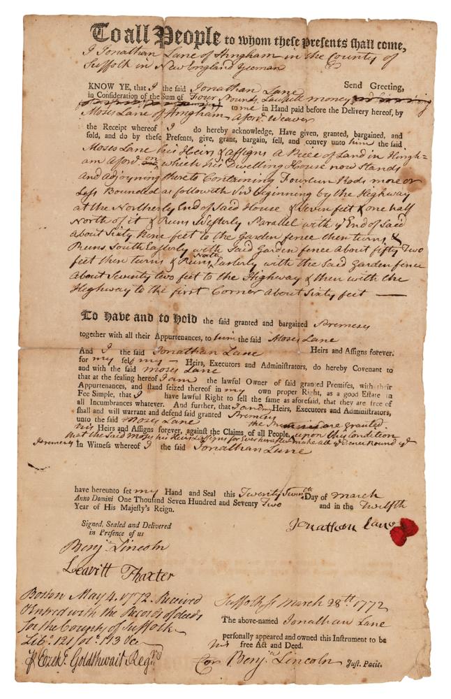 Major general in the Continental Army (1733-1810) during the American Revolutionary War, known as the officer who formally accepted the British surrender at Yorktown. Partly-printed DS, signed twice, "Benj. Lincoln," one page, 8 x 13, March 28, 1772. Agreement by which Jonathan Lane of Hingham sells Moses Lane a “piece of Land in Hingham afor’d on which his Dwelling House now stands and adjoining thereto containing Fourteen Rods more or less” for the sum of “Four pounds Lawfull money.” Signed at the conclusion by Lincoln as a witness and then below as justice of the peace. In very good to fine condition, with scattered light foxing and staining.