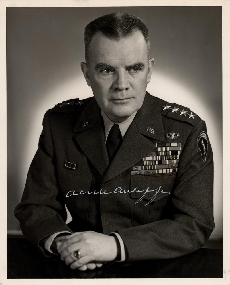 Vintage matte-finish 8 x 10 photo of General Anthony 'Nuts' McAuliffe in his four-star military uniform, signed neatly across his chest in white ink, "A. C. McAuliffe." Reverse bears U.S. Army Photograph credit text. In fine condition, with some trivial creasing to the lower left corner.