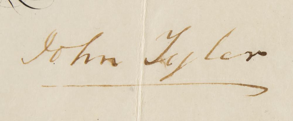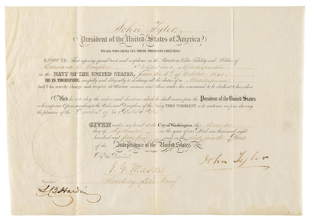 Partly-printed vellum DS as president, one page, 11 x 8, September 2, 1844. President Tyler appoints Edward C. Grafton as a "Midshipman in the Navy of the United States." Signed boldly at the conclusion by John Tyler as president and countersigned by John Mason as secretary of the Navy. In fine condition. Grafton was later commissioned lieutenant, lieutenant commander, and commander. On being commissioned lieutenant commander he was placed in command of the steam gunboat ‘Genesee’ and participated in the bombardment of Fort Morgan in Mobile Bay. In 1866 he was in command of the USS Gettysburg of the North Atlantic Squadron.