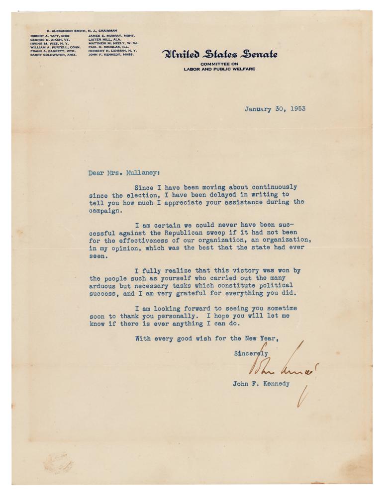 TLS signed “John Kennedy,” one page, 8 x 10.5, United States Senate, Committee on Labor and Public Welfare letterhead, January 30, 1953. Letter to Mrs. Mullaney, in full: “Since I have been moving about continuously since the election, I have been delayed in writing to tell you how much I appreciate your assistance during the campaign. I am certain we could never have been successful against the Republican sweep if it had not been for the effectiveness of our organization, an organization, in my opinion, which was the best that the state had ever seen. I fully realize that this victory was won by the people such as yourself who carried out the many arduous but necessary tasks which constitute political success, and I am very grateful for everything you did. I am looking forward to seeing you sometime soon to thank you personally. I hope you will let me know if there is ever anything I can do. With every good wish for the New Year.” In very good to fine condition, with some scattered light toning. Congressman Kennedy had won his Senate election in November 1952 and took his seat in the Senate on January 3, 1953. At the start of his first term, he focused on Massachusetts-specific issues by sponsoring bills to help the fishing, textile manufacturing, and watch-making industries.