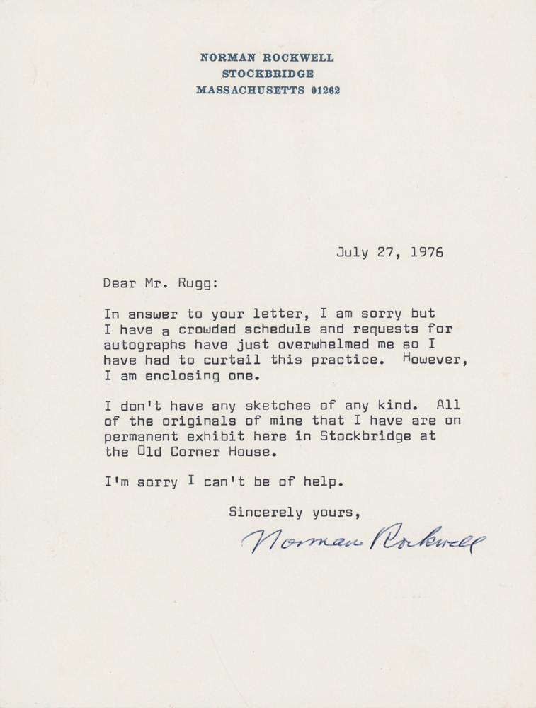 TLS, one page, 6 x 7.75, personal letterhead, July 27, 1976. Letter to Mr. Rugg, in full: “In answer to your letter, I am sorry but I have a crowded schedule and requests for autographs have just overwhelmed me so I have had to curtail this practice. However, I am enclosing one. I don’t have any original sketches of any kind. All of the originals of mine that I have are on permanent exhibit here in Stockbridge at the Old Corner House. I’m sorry I can’t be of help.” In very fine condition.