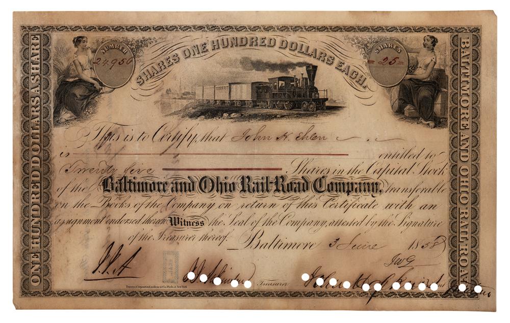 American entrepreneur, abolitionist, and philanthropist (1795-1873) whose legacy lives on in numerous foundations and institutions, such as Johns Hopkins Hospital and Johns Hopkins University. Partly-printed DS, one page, 10 x 6.25, June 3, 1858. Stock certificate for 25 shares in the Baltimore and Ohio Rail-Road Company issued to John H. Ehlen, signed at the conclusion by John Hopkins as the company's president. In very good to fine condition, with light dampstaining, and the usual cancellation holes touching Hopkins' signature.