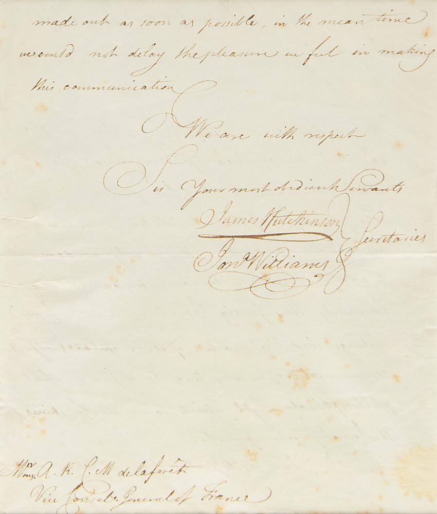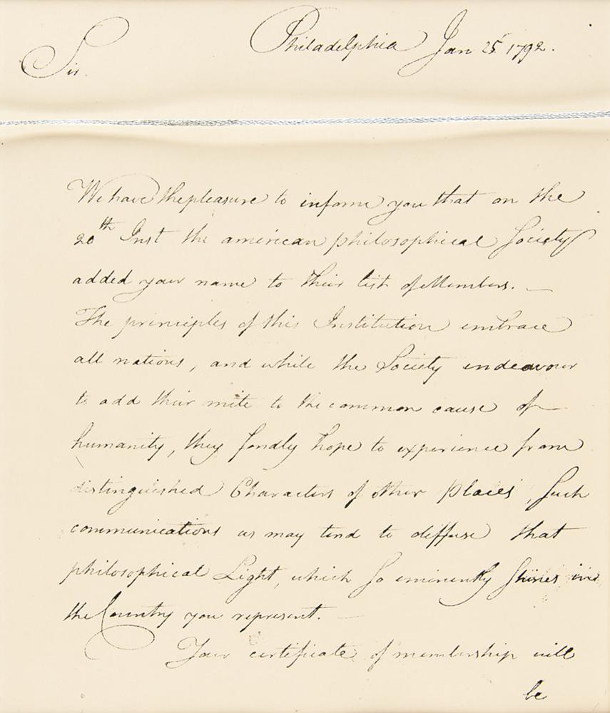 On the frame's reverse is a window containing an ALS by Jonathan Williams, countersigned by James Hutchinson, one page both sides, 8.5 x 7.25, January 25, 1792, notifying de la Forest of his election as a member. In full: "We have the pleasure to inform you that on the 20th Inst. the American Philosophical Society added your name to their list of Members.—The principles of this Institution embrace all nations, and while the Society endeavors to add their mite to the common cause of humanity, they fondly hope to experience from distinguished Characters of other places, Such communications as may tend to diffuse that philosophical Light, which so eminently shines in the Country you represent. Your certificate of membership will be made out as soon as possible, in the meantime we could not delay the pleasure we feel in making this communication." In fine to very fine condition, with intersecting folds and exceptionally bold, ideal signatures.