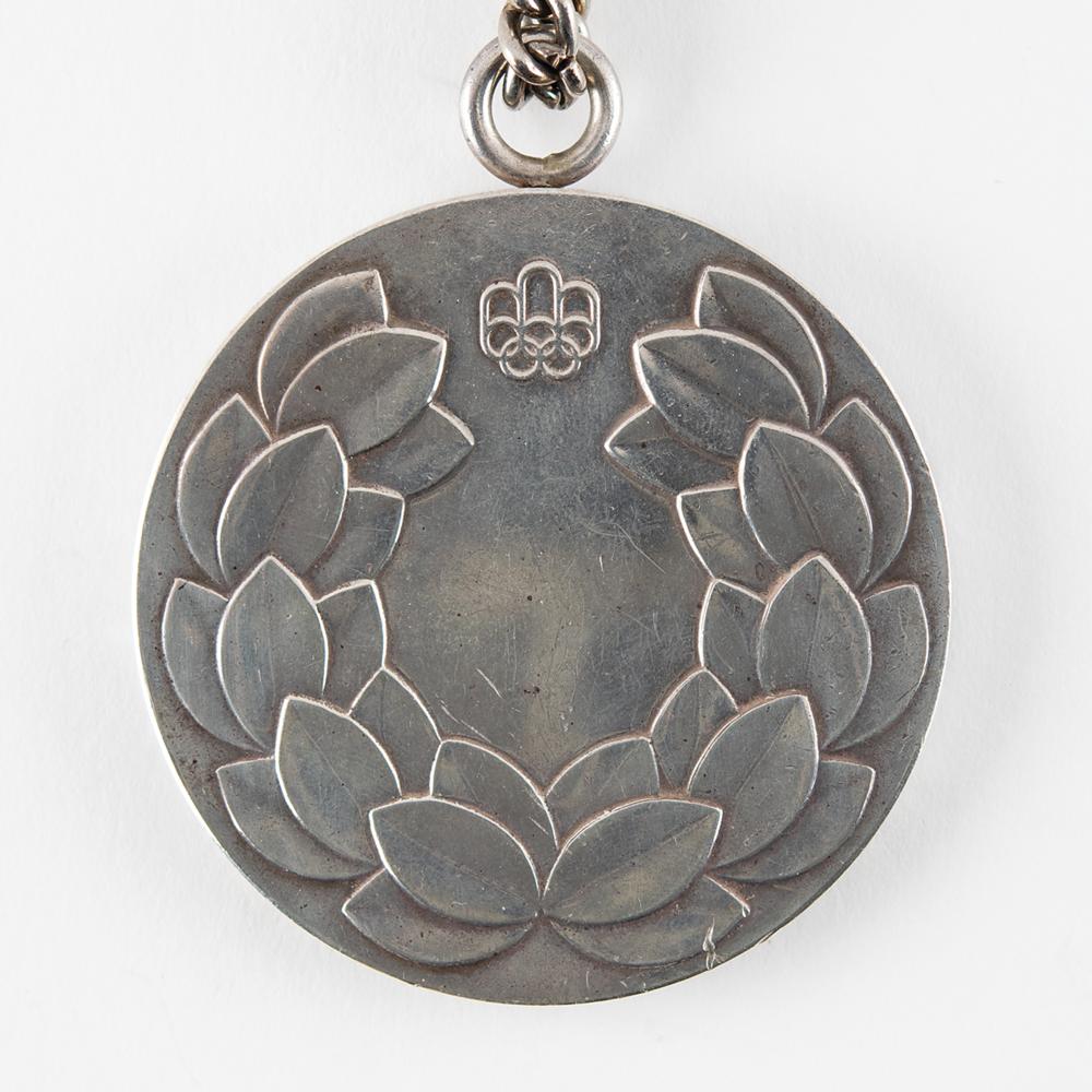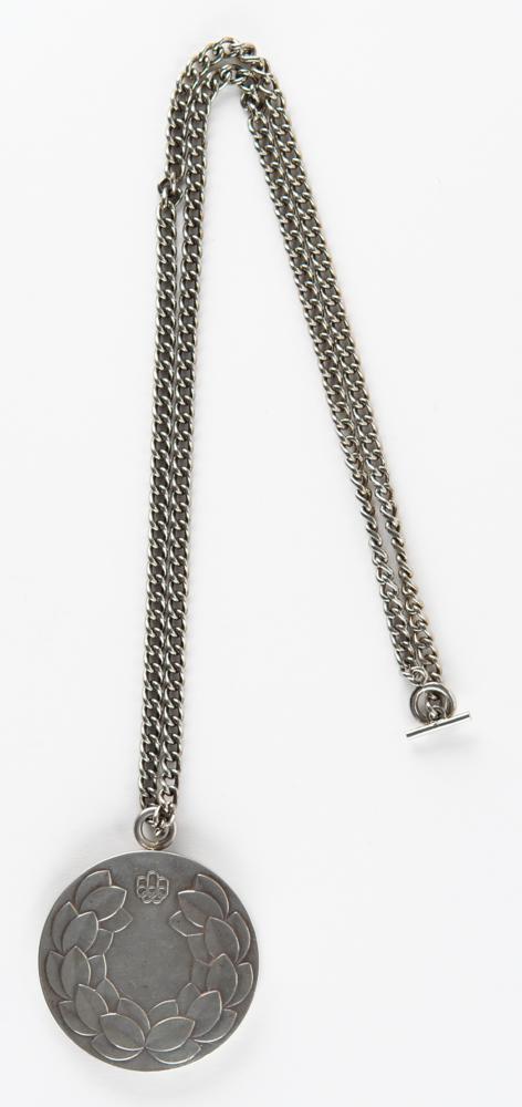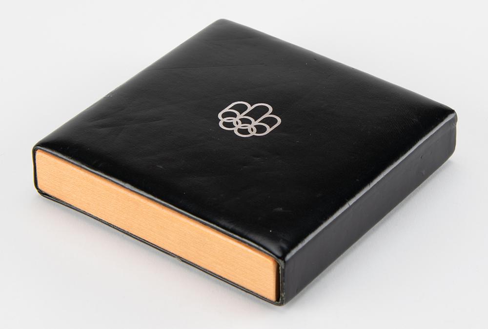 Winner's medal awarded to Cuban boxer Sixto Soria at the Montreal 1976 Summer Olympics. Silver, 60 mm, 154 gm, by Giuseppe Cassioli, Ottawa. The front, inscribed, "XXIe Olympiade Montreal 1976," features a 'Seated Victory' with the Coliseum in the background; the reverse features the Montreal Olympic emblem and victor's laurel wreath. The bottom edge is engraved with the sport, "Boxe." Complete with its silver chain and wooden presentation box with black leather slipcover, emblazoned with the emblem of the Montreal Olympiad.