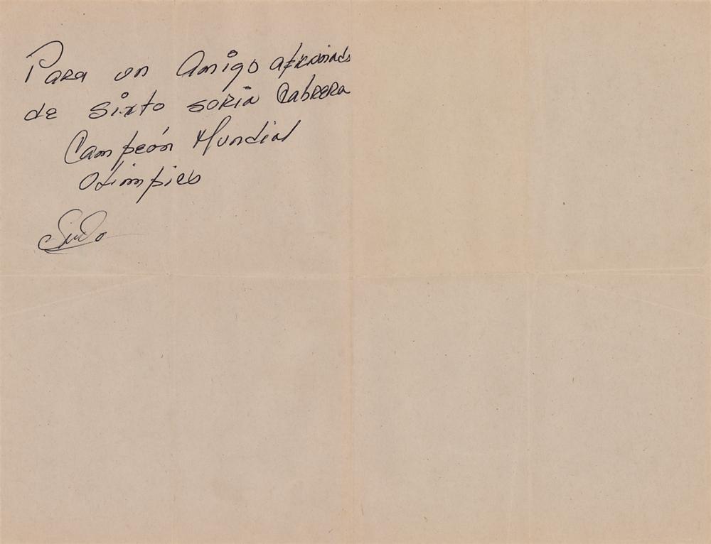 Accompanied by a brief note signed by Sixto Soria, who lost to Leon Spinks in the final round of the light heavyweight division. Following a bye, two knockouts, and a first-round stoppage, Soria squared off against the menacing Leon Spinks in the championship contest. Spinks battered Soria all around the ring for three rounds, with the referee mercifully stopping the bout at 1:09 of the third. Spinks turned professional after the Games, and famously defeated Muhammad Ali to take the world heavyweight crown in 1978. A fantastic second-place silver from a historic Olympic boxing match.
