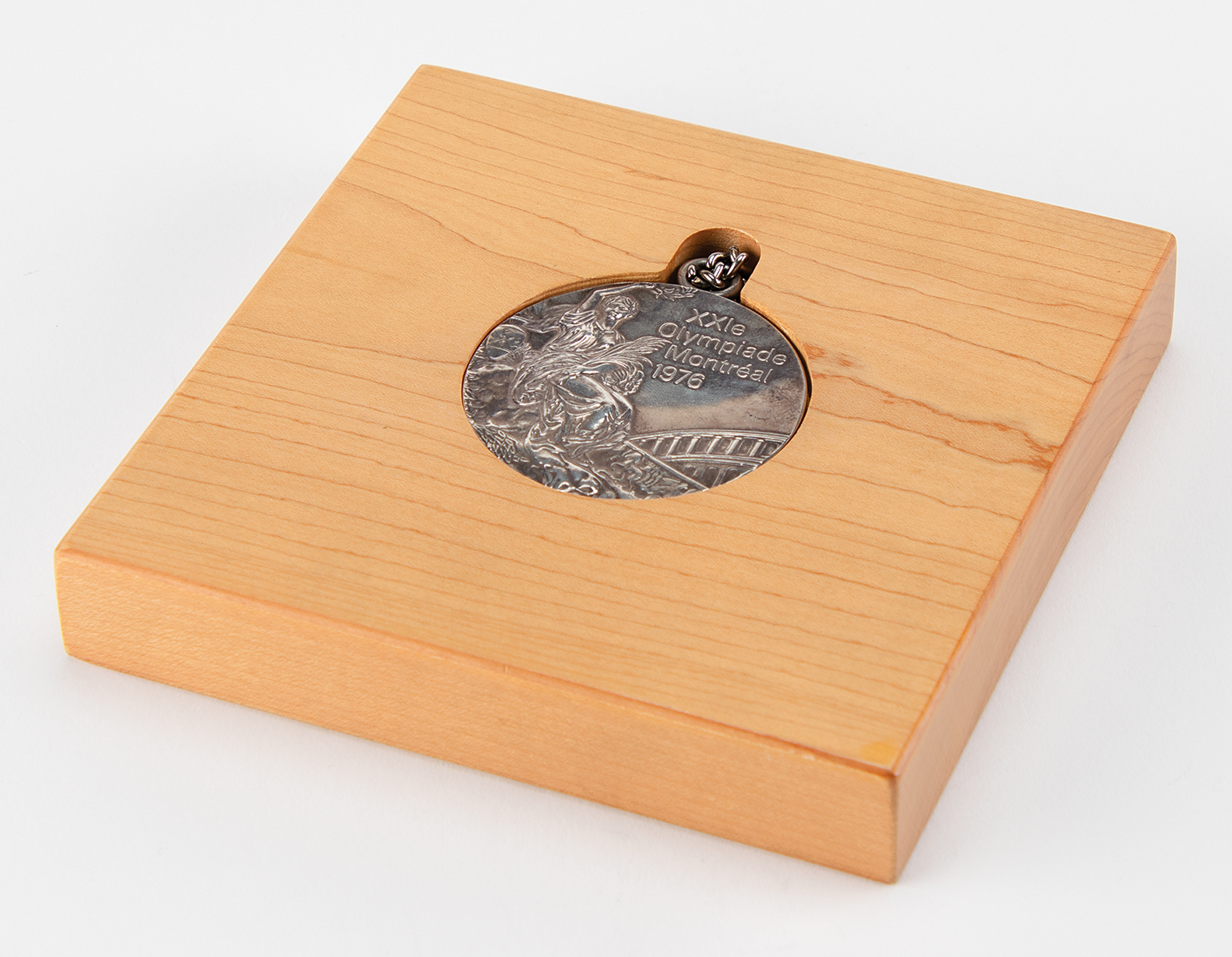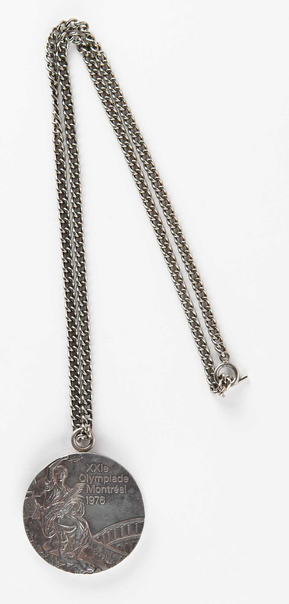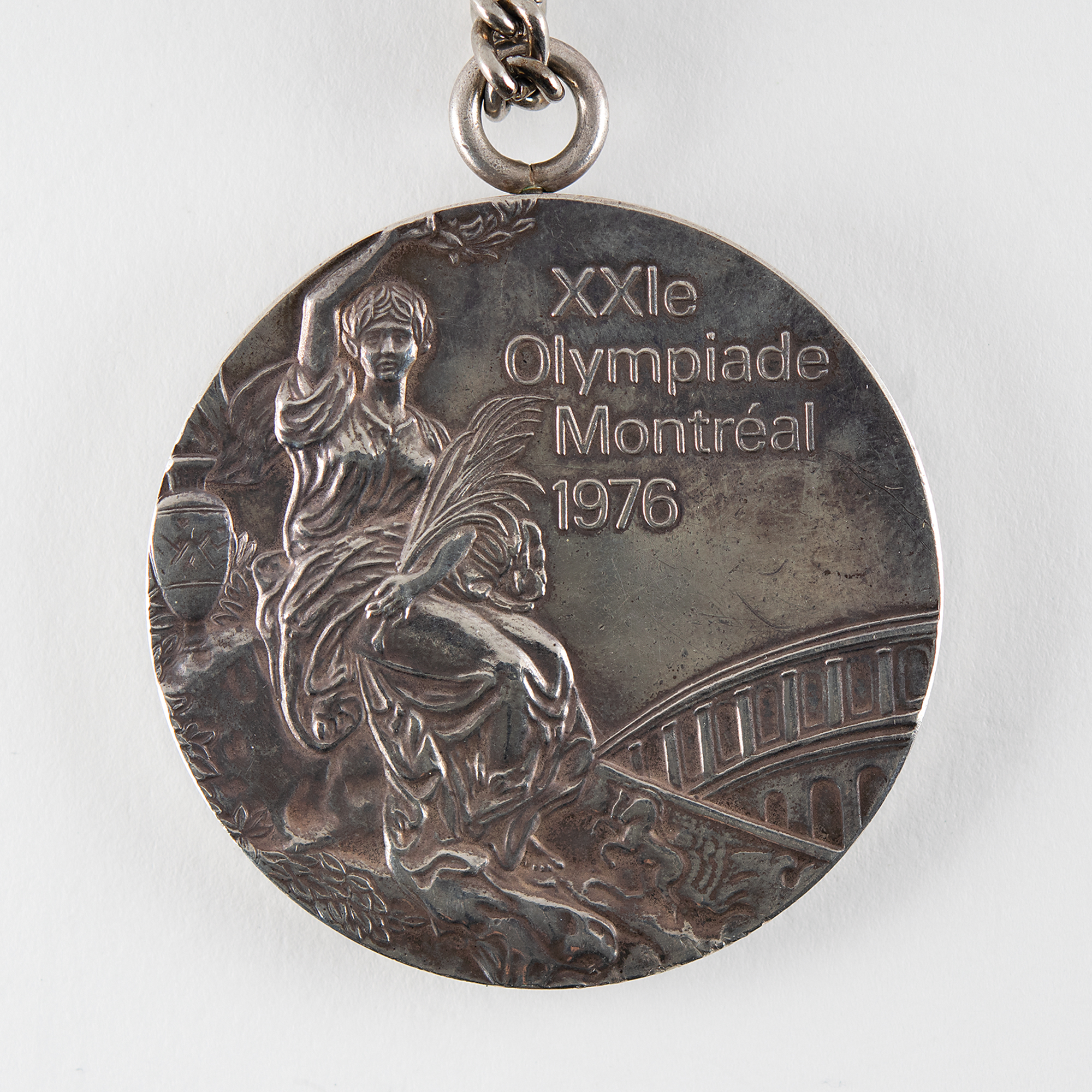 Winner's medal awarded to Cuban boxer Sixto Soria at the Montreal 1976 Summer Olympics. Silver, 60 mm, 154 gm, by Giuseppe Cassioli, Ottawa. The front, inscribed, "XXIe Olympiade Montreal 1976," features a 'Seated Victory' with the Coliseum in the background; the reverse features the Montreal Olympic emblem and victor's laurel wreath. The bottom edge is engraved with the sport, "Boxe." Complete with its silver chain and wooden presentation box with black leather slipcover, emblazoned with the emblem of the Montreal Olympiad.