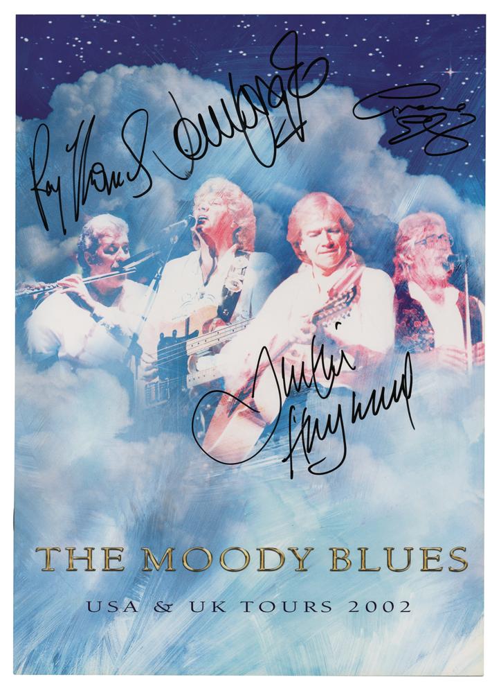 Appealing tour book for the Moody Blues’ 2002 Fall Tour of the United States, 9.5 x 13.5, signed on the front cover in black felt tip by John Lodge, Graeme Edge, Ray Thomas, and Justin Hayward. In very fine condition.