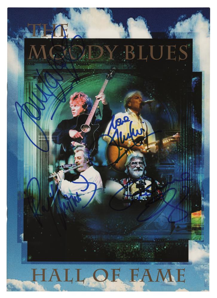 Attractive tour book for the Moody Blues’ 2001 Summer Tour of the United States, 9.25 x 13, signed on the front cover in blue felt tip by John Lodge, Graeme Edge, Ray Thomas, and Justin Hayward. In very fine condition.