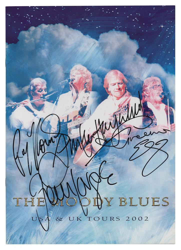 Appealing tour book for the Moody Blues’ 2002 Spring Tours of the United States and the United Kingdom, 9.5 x 13.5, signed on the front cover in black felt tip by John Lodge, Graeme Edge, Ray Thomas, and Justin Hayward. In very fine condition.