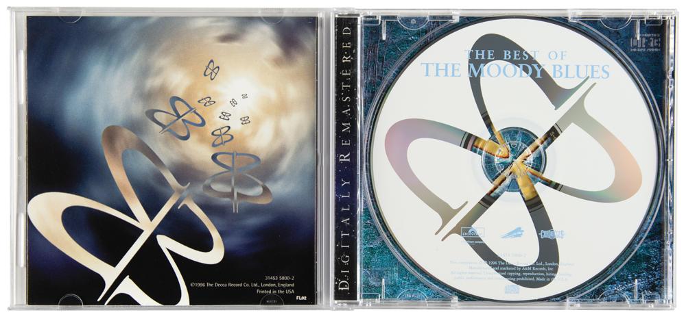 The Best of the Moody Blues compilation album CD, signed on the front cover in silver ink by John Lodge, Graeme Edge, Ray Thomas, and Justin Hayward. In fine condition. The CD is included.