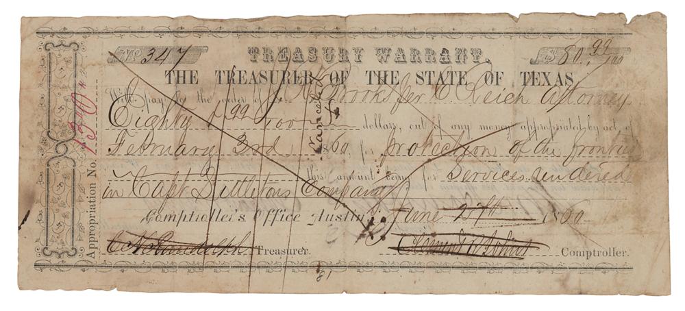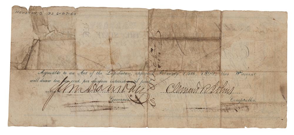Partly-printed DS, one page, 8.25 x 3.5, June 27, 1860. Treasury warrant for $80.99 for "protection of the frontier, this amount being for services rendered in Capt. Settleton's Company." Signed on the front in ink by Treasurer Cyrus Halbert Randolph and Comptroller Clement R. Johns (both signatures canceled), and endorsed on the reverse by Governor Sam Houston and Comptroller Clement R. Johns. In very good condition, with multiple folds, creasing, and irregular toning. A desirable format signed by the legendary Texas governor.