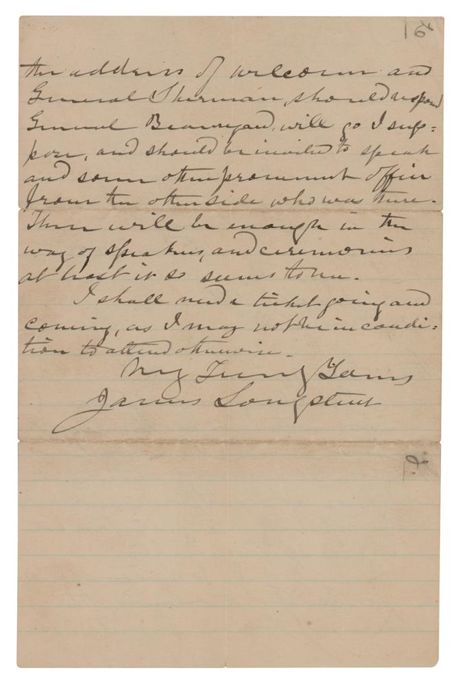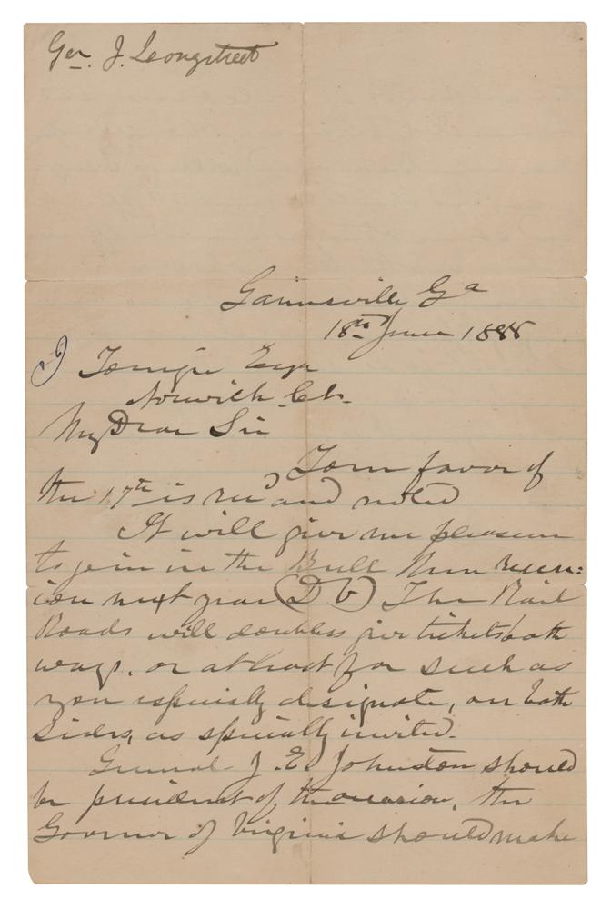 ALS, one page both sides, 5.5 x 8.5, June 18, 1888. Handwritten letter expressing his interest in attending the Bull Run reunion. In part: "It will give me pleasure to join in the Bull Run Reunion next year…General J. E. Johnston should be president of the occasion. The Governor of Virginia should make the address of welcome and General Sherman should respond. General Beauregard will go I suppose and should be invited to speak and some other prominent officer from the other side who was there. There will be enough in the way of speakers and ceremonies at least it so seems to me. I shall need a ticket going and coming, as I may not be in condition to attend otherwise." In fine condition, with some short fold splits.