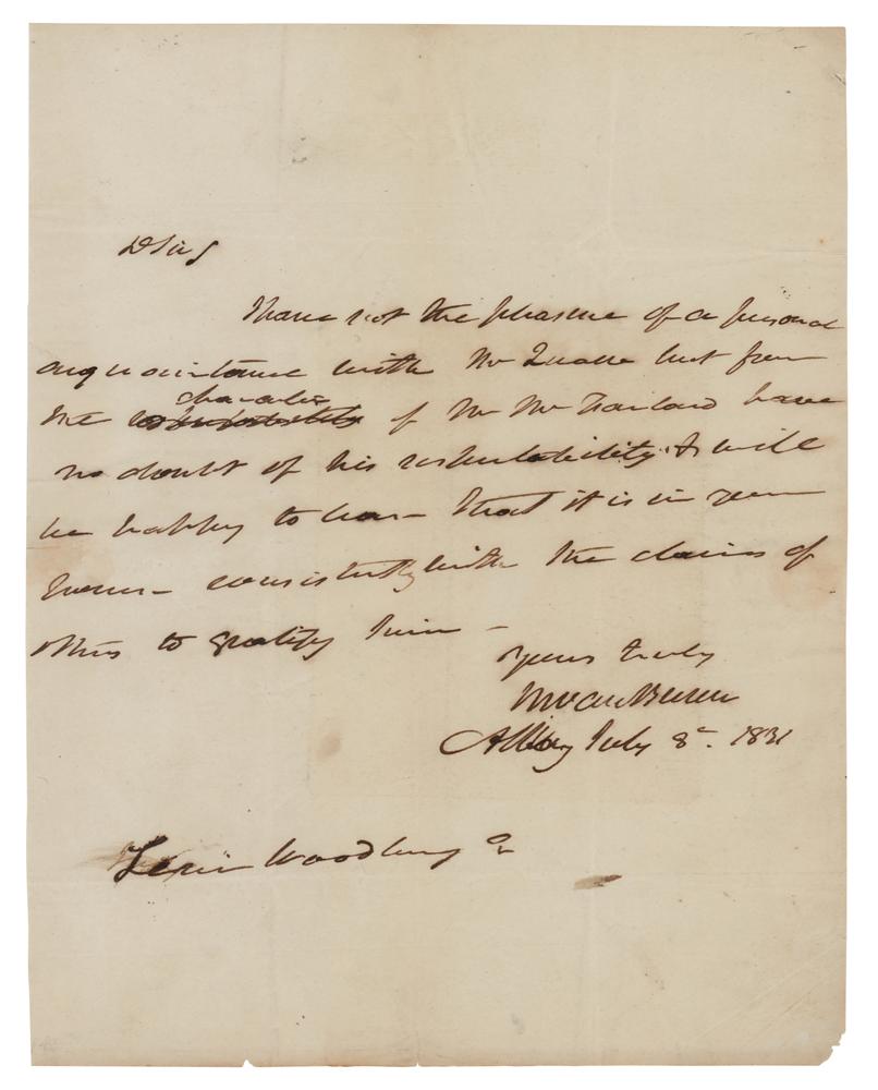 ALS signed "M. Van Buren," one page, 7.5 x 9.75, July 8, 1831. Handwritten letter to writes to Secretary of the Navy Levi Woodbury, in part: "I have not the pleasure of a personal acquaintance with Mr. Quane but from the character of Mr. McFarland have no doubt of his respectability & will be happy to hear that it is in your power consistently with the claims of others to quality him." In fine condition.