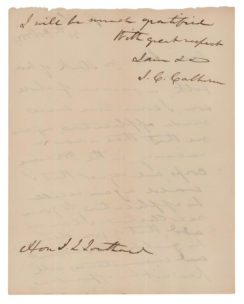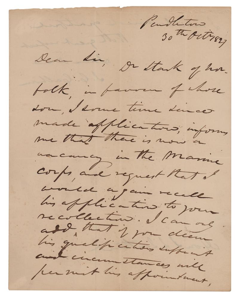 Prominent American politician (1782-1850) who served as vice president under John Quincy Adams and Andrew Jackson. He later wielded great power and influence in the Senate as a champion of Southern causes, including slavery. ALS signed "J. C. Calhoun," one page both sides, 7.5 x 9.5, October 30, 1827. Handwritten letter to Secretary of the Navy Samuel L. Southard, in full: "Dr. Stark of Norfolk, in favour of whose son, I some time since made application, informs me that there is now a vacancy in the Marine Corps, and request that I would again recall his application to your recollection. I can only add that if you deem his qualifications sufficient and circumstances will permit his appointment, I will be much gratified." In fine condition.