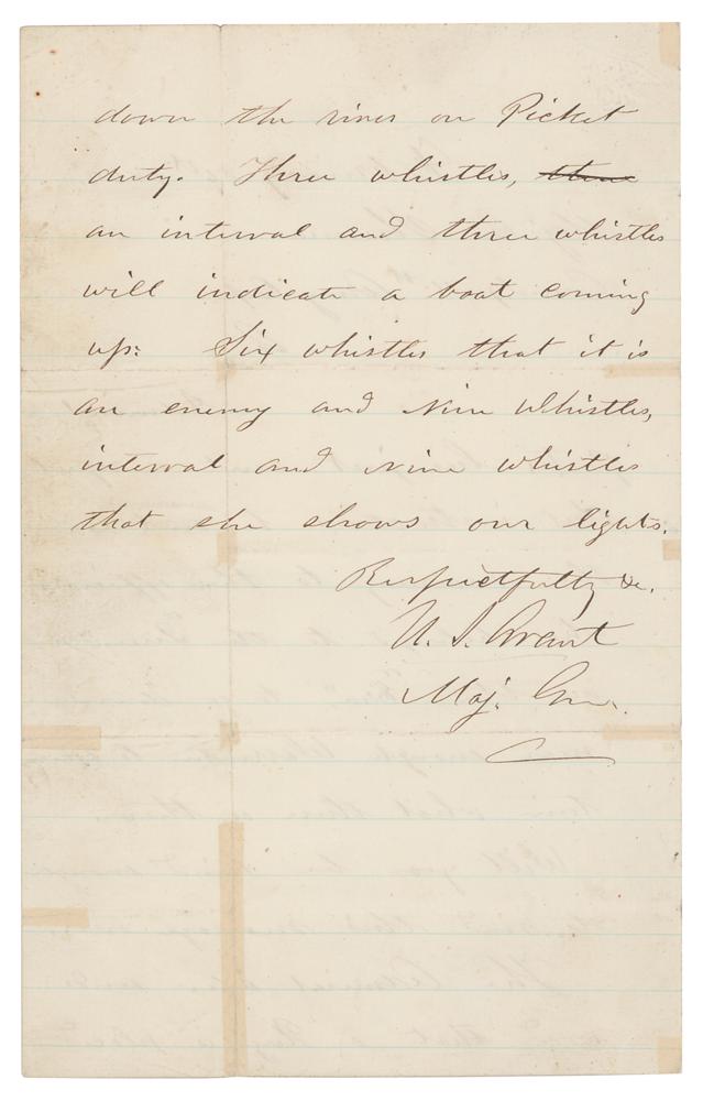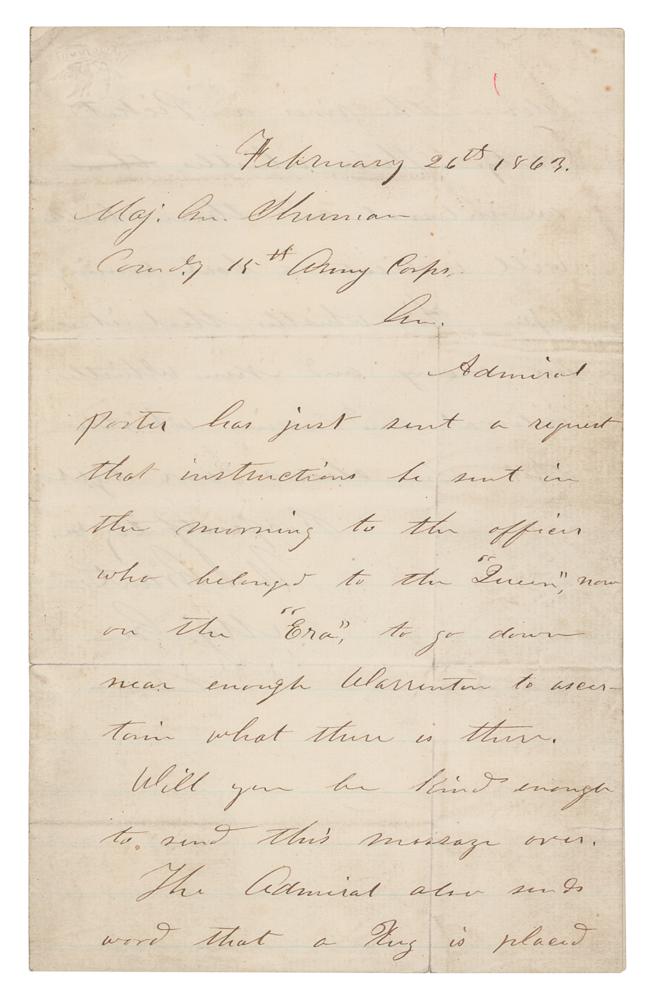 Significant Civil War-dated ALS signed "U. S. Grant, Maj. Gen.," one page both sides, 5 x 8, February 26, 1863. Handwritten letter to "Major General William T. Sherman, Commanding, 15th Army Corps," in full: "Admiral Porter has just sent a request that instructions be sent in the morning to the officers who belonged to the 'Queen,' now on the 'Era,' to go down near enough Warrenton to ascertain what there is there. Will you be kind enough to send this message over. The Admiral also sends word that a Tug is placed down the river on Picket duty. Three whistles, an interval and three whistles will indicate a boat coming up: Six whistles that it is an enemy and Nine Whistles, interval and Nine Whistles that she shows our lights." The reverse of the adjoining leaf is docketed in an unknown hand: "February 26, 1863. Grant, U.S. Maj. Genl. Comd'g. wants an officer on the 'Era' to go to Warrenton & see what is there. A Tug is stationed on Picket duty. Signals agreed on, to be given by the Tug. Copy for Genls. Steele & Stuart." Sherman has added a handwritten endorsement beneath: "I made orders for Col. Wood & Sent the Infor along. Sherman." In very good to fine condition, with light soiling, and tiny old archival repairs to the multiple intersecting folds.