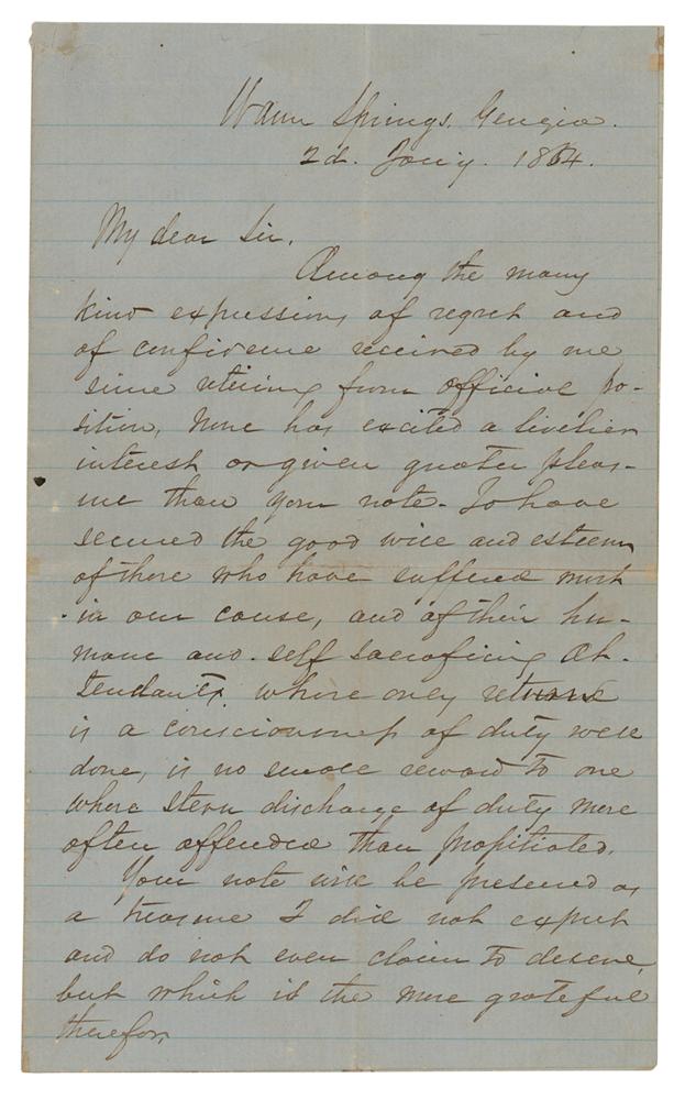 Civil War-dated ALS, three pages on two adjoining sheets, 5.5 x 9, January 2, 1864. Handwritten letter to surgeon S. H. Stout, the medical director of hospitals in Atlanta. In part: "Among the many kind expressions of regret and of confidence received by me since retiring from official position, none has excited a livelier interest or given greater pleasure than your note. To have secured the good will and esteem to those who have suffered most in our cause, and of their humane and self-sacrificing…whose only return is a consciousness of duty well done, is no small reward to one whose stern discharge of duty more often offended than propitiated…