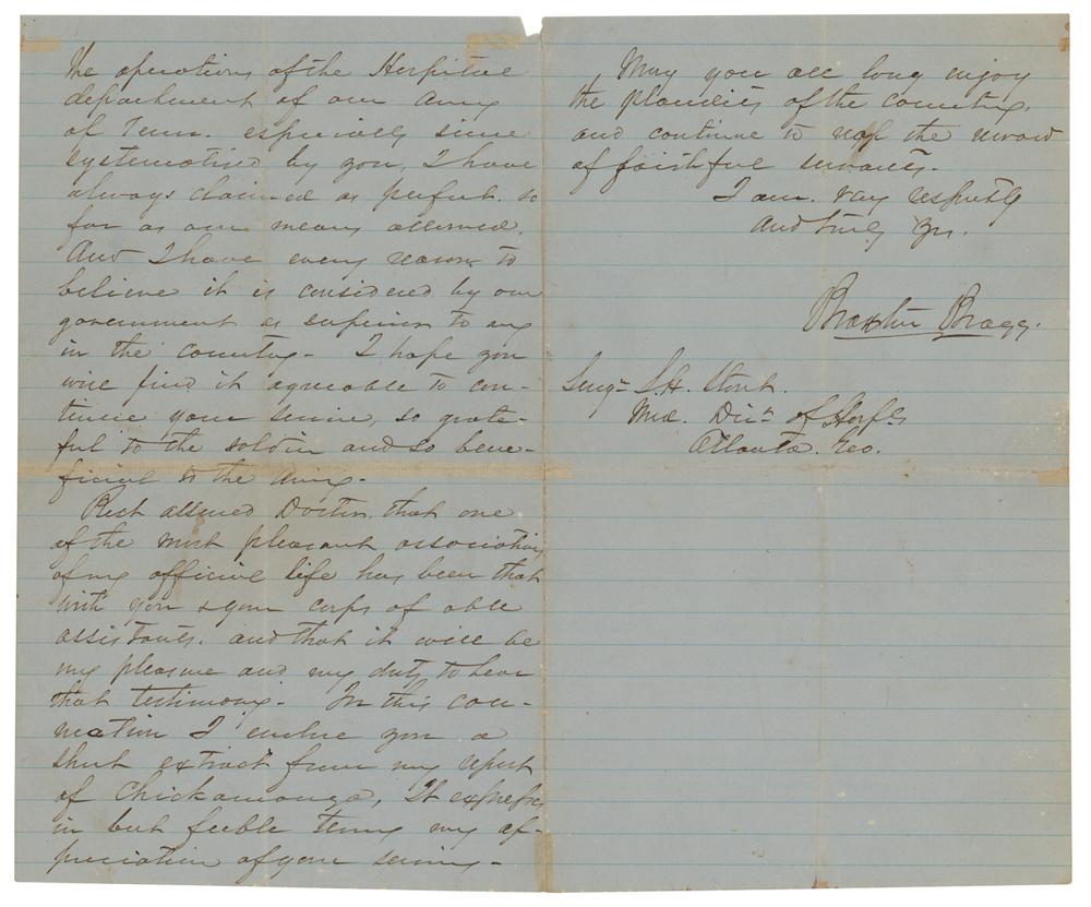 Bragg had recently retired from his "official position" as commander of the Army of Tennessee and was about to be named Jefferson Davis' military advisor when he responded to a letter from a medical director in Georgia. Having been under fire by his subordinate generals for a perceived unwillingness to capitalize on the Confederate victory at Chickamauga, Bragg was grateful to have received correspondence from an ally. He also shows his clear respect for those Confederate troops wounded during the war—"those who have suffered most in our cause"—many of whom were wounded at Chickamauga. The report that Bragg references here lauded the medical personnel who showed exemplary conduct during the battle—the highest possible praise afforded as individual medals were not awarded. A terrific reference from one of the Confederacy's greatest generals to one of the South's key battles.