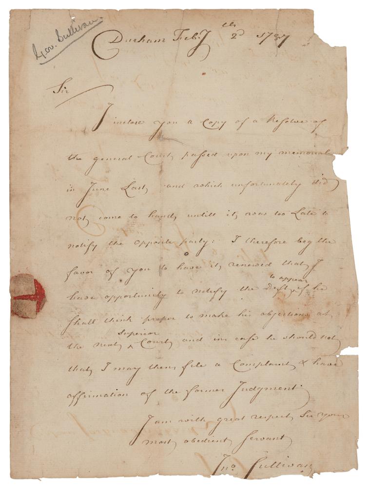 American general in the Revolutionary War and a delegate in the Continental Congress (1740-1795) who served as governor of New Hampshire. He is best remembered for commanding the Sullivan Expedition in 1779, a scorched earth campaign against the Iroquois towns that had taken up arms against the American revolutionaries. ALS signed "Jno. Sullivan," one page, 7.5 x 9.75, February 2, 1787. Handwritten to an unidentified gentleman. In part: "I send you a copy of the Resolve of the general Court?I beg the favor of you to have it renewed that I have the opp'ty to notify the Def't to appear?that I may then file a Complaint & have affirmation." In very good to fine condition, with overall light creasing, scattered light staining, and edge loss affecting the capital letters of the signature.
