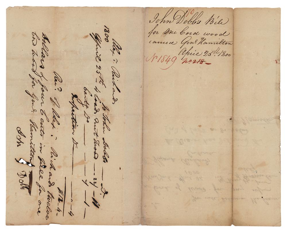 ANS signed "A. Hamilton," one page, 5 x 8, April 24, 1800. Brief handwritten note by Alexander Hamilton to Alexander Richards, in full: "You will deliver the bearer a Cord of Wood for my use." Under Hamilton's note, his wife Eliza writes: "the Bearer has delivered the Cord of Wood as directed. E. Hamilton." The second integral page bears a handwritten receipt from Alexander Richards to John Dobbs documenting the delivery of "4 loads nut wood," dated April 25, 1800. In very good to fine condition, with light soiling and toning, and archival tape reinforcement along the hinge