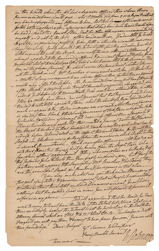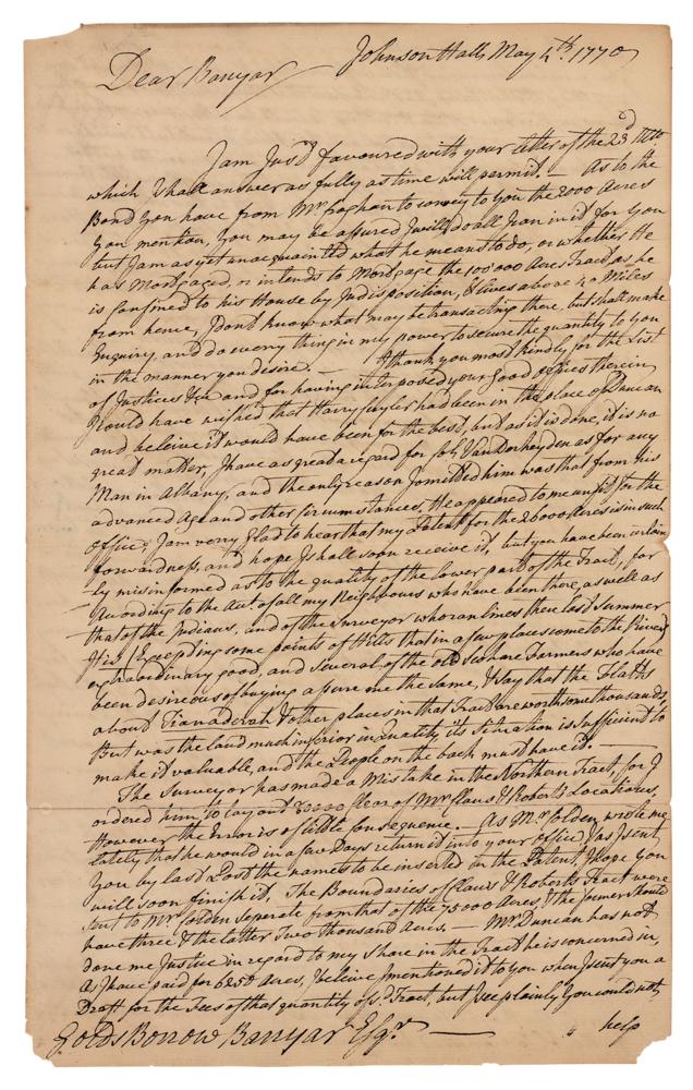 Irish-born military officer (1715-1774) who fought in the French and Indian War and who served as British superintendent of Indian Affairs, based in New York from 1755 to 1774. ALS signed “W. Johnson,” two pages both sides, 8 x 13, May 4, 1770. Long handwritten letter to Goldsbrow Banyar concerning a tract of land. In part: "You have been misinformed as to the quality of lower part of the Tract, for according to the acct. of all my neighbours who have been there, as well as that of the Indians, and of the surveyor who ran lines there last summer, it is?extraordinary good, and several of the old Scohare Farmers who have been desirous of buying assure me of the same?I know nothing of the affair you mention concerning Indian Officers Rights?had I imagined that they would have been allowed Lands on the terms of the Military, I should have long since applied in favour of them all, and in that case you may be assured I should have served you to the utmost of my power."