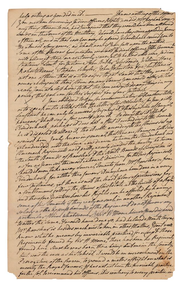 He goes on to comment on military matters: "Except those Regiments formed by Sir H. Moore, there has been no Regiments formed here?there being but one in the county?It has not been the invariable practice for the Col. to recommend his officers, it is contrary to every practice in the world, where the Col. has a superior officer thro' whom these recommendations should pass. Sir H. Moore did form 2 or 3 Regm'ts without my having suggested any officers to him, but this he afterwards was so polite as to apologize for, assuring me that it had been done to save trouble."