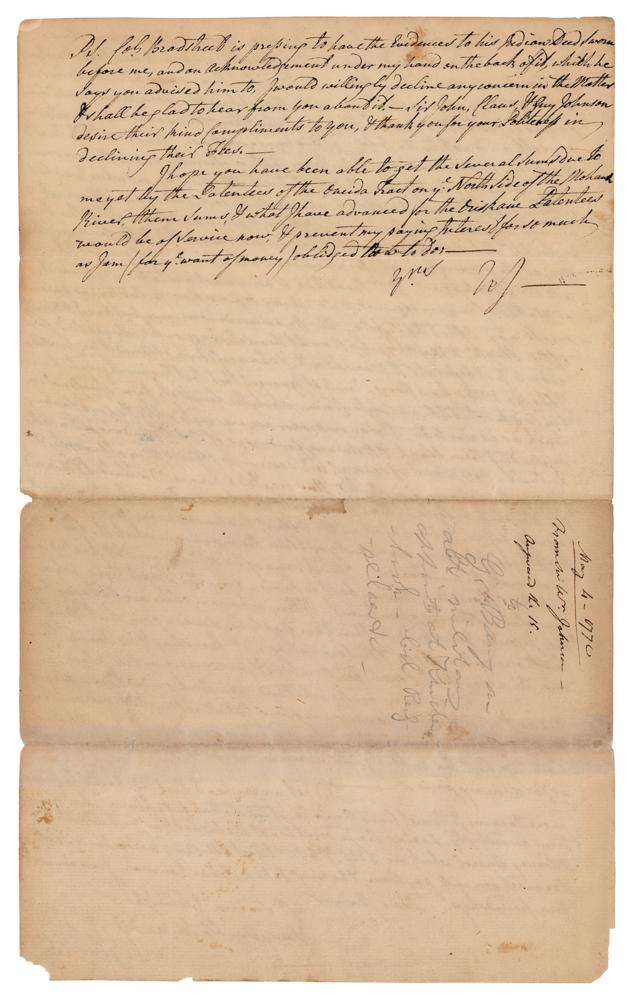 He adds a postscript, initialed "W. J.," in part: "Col. Bradstreet is pressing to have the evidences to his Indian Deed sworn before me, and an acknowledgment under my hand on the back of it, which he says you advised him to. I would willingly decline any concern in the matter & shall be glad to hear from you about it." In very good to fine condition, with some edge chipping and archival repairs to fold separations.