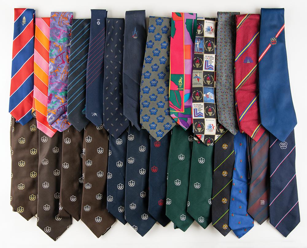 Impressive collection of 62 Olympics-related neckties from the personal collection of longtime IOC member James Worrall. The ties were all produced exclusively for various Olympic Summer and Winter Games, committees, or special conferences, such as: Montreal 1976 (9), Innsbruck 1976, Lake Placid 1980, Sarajevo 1984, Calgary 1988, Barcelona 1992, Lillehammer 1994, Atlanta 1996, Torino 2006, the Australian Olympic Committee, the National Olympic Committee of the GDR, the Monaco Olympic Committee, the Russian Olympic Committee, and the 1994 Paris Olympic Congress. The collection also includes ties for bid cities like Nagoya 1988, Sofia 1994, and Toronto 1996. Twenty-one of the ties are sealed in their original packaging. In overall fine condition.