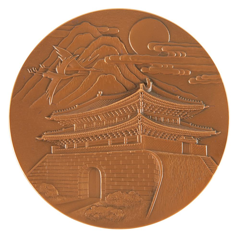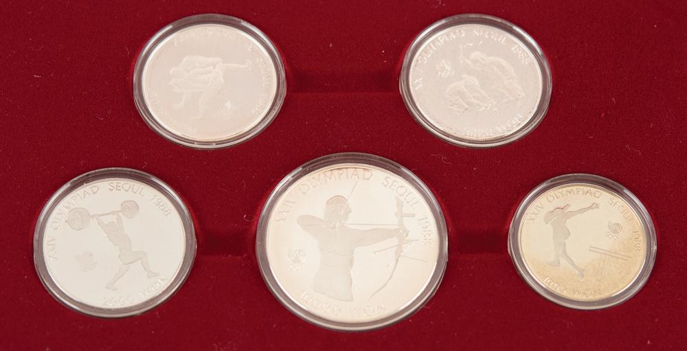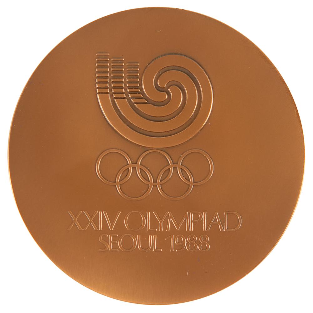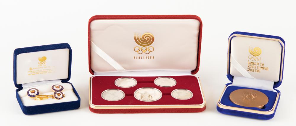 Commemorative items issued for the Seoul 1988 Summer Olympics, from the collection of IOC member James Worrall, including: a bronze participation medal, 60 mm, 115 gm, with the front depicting Namdaemun, one of the gates in the Fortress Wall of Seoul, with mountains, clouds, cranes, and the sun, and the reverse bearing the Seoul Games emblem, with "XXIV Olympiad, Seoul 1988," housed in its purple velvet case; a boxed set of two enameled cuff links and a matching tie pin featuring the emblem of the Games, produced by Eden Arts Ind Co., Ltd.; and a boxed set of five commemorative coins minted to honor the Seoul 1988 Summer Olympics, including three sterling silver coins, a nickel coin, and a cupronickel coin. In overall fine condition.