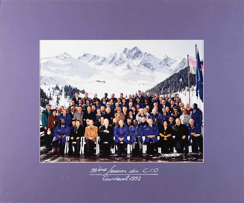 Color glossy 15.5 x 11.5 group photograph of the attendees of the 98th session of the International Olympic Committee at Courchevel, the ski resort that hosted the alpine events of the Albertville 1992 Winter Olympics. Matted to an overall size of 23.5 x 19.5, captioned on the mat in white ink: "98eme Session du C.I.O., Courchevel 1992." In fine condition.