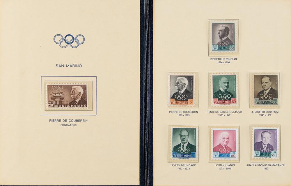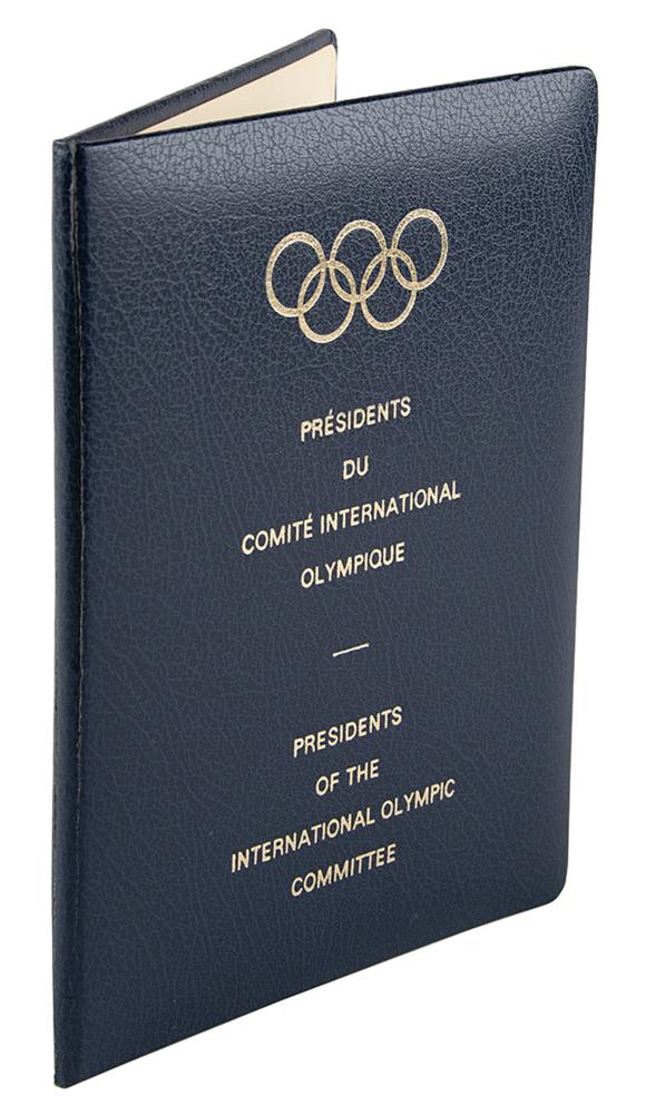From the collection of James Worrall—an attractive leather booklet issued by the San Marino Olympic Committee containing eight Italian stamps honoring past presidents of the International Olympic Committee: Pierre de Coubertin (2), Demetrius Vikelas, Henri de Baillet-Latour, Sigfrid Edstrom, Avery Brundage, Lord Killanin, and Juan Antonio Samaranch. The booklet measures 5.5 x 7 and features gilt text to the front cover. In fine condition.