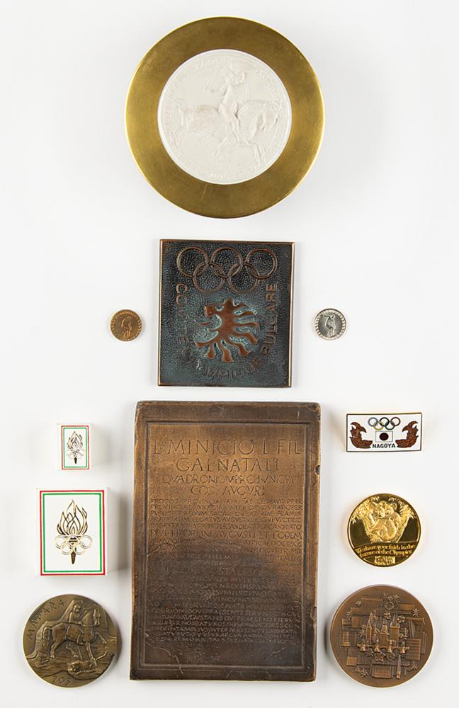 Collection of ten commemorative IOC session and meeting items from the collection of IOC member James Worrall, including: a ceramic box by Villeroy & Boch from the 71st IOC session held in Luxembourg in 1971, featuring a horse and rider raised in relief on the lid; a bronze medal from the 10th Olympic Congress held in Varna in 1973; a boxed mini book set entitled "Our Olympic Champions," published in Budapest in 1974; a bronze Bulgarian Olympic Committee plaque from the Montreal 1976 Summer Olympics; a bronze medal commemorating the 79th IOC session held in Prague in 1977; an enameled pin from the 1979 IOC board meeting in Nagoya, Japan; a medal commemorating Brisbane's bid for the 1992 Olympic Games; two coins from the 104th IOC session held in Budapest in 1994; a bronze plaque reproducing an ancient tablet, housed in a wooden box. In overall fine condition.