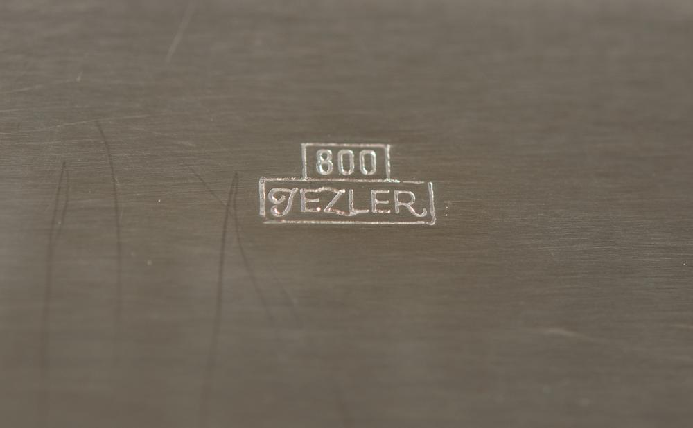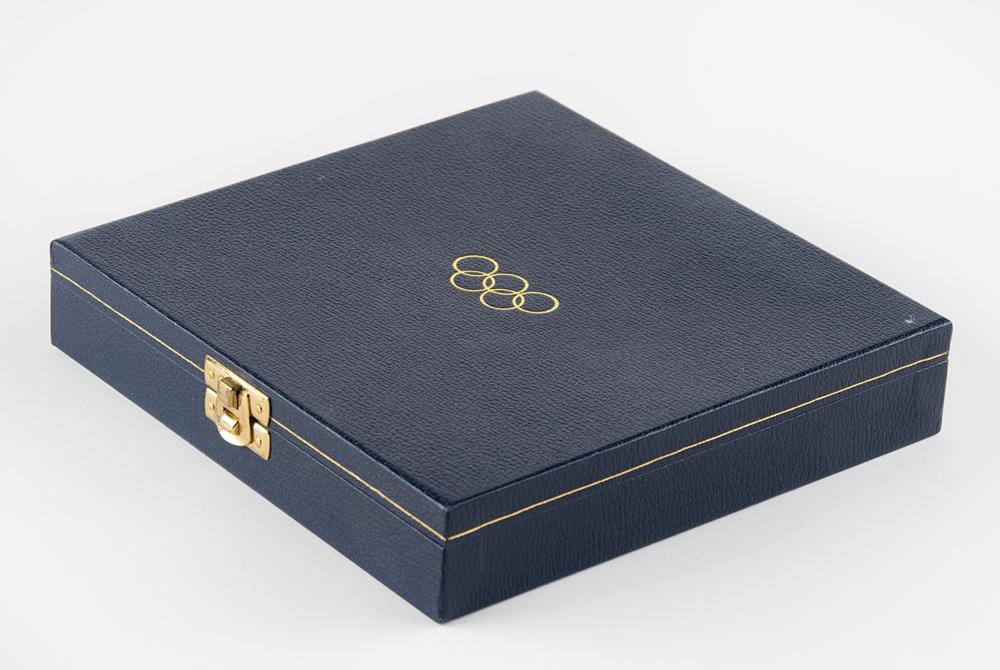 Attractive silver bowl, 6″ x 6″ x 1″, 184 grams, with bowl section bearing engraved Olympic rings and the signature of IOC President Juan Antonio Samaranch. The underside of the bowl features an 800 hallmark and “Jezler” maker’s mark, and is numbered below, “34—134.” In very good to fine condition, with light overall scuffing and some traces of discoloration. Accompanied by its original leather presentation case.