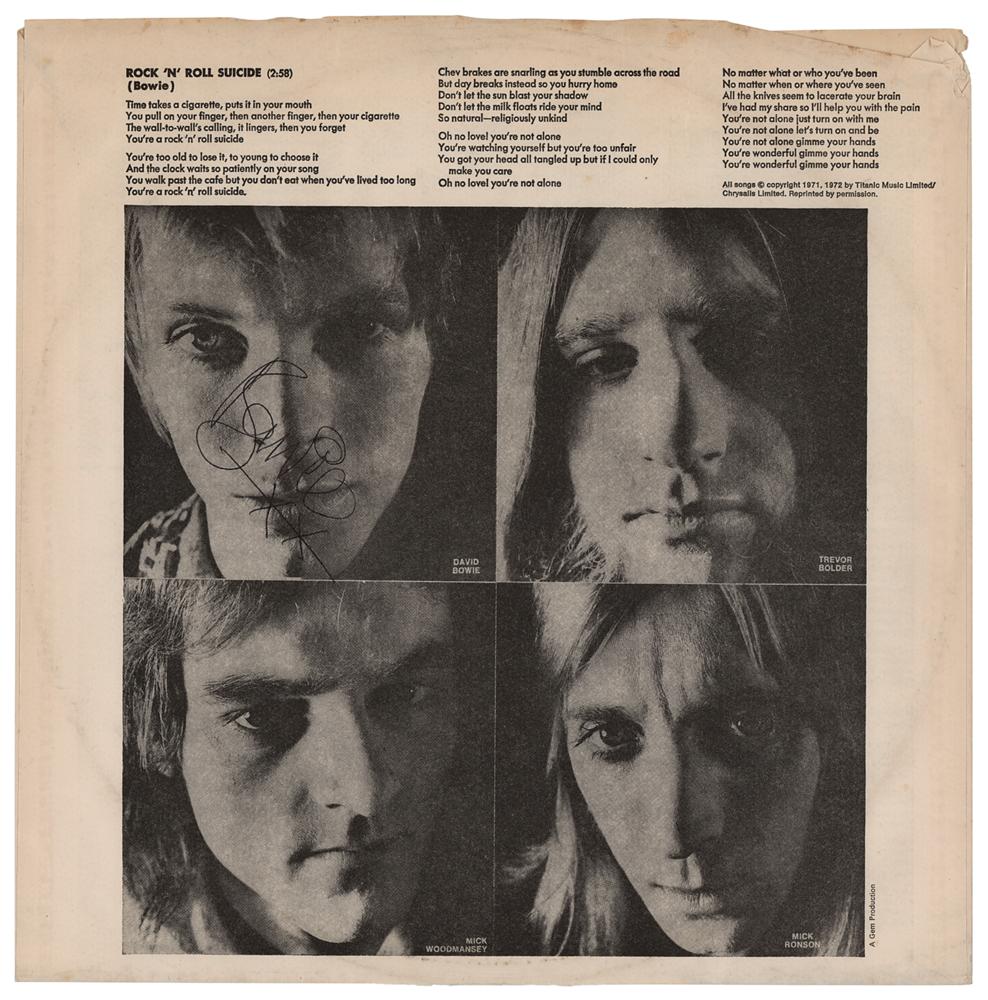 Ziggy Stardust inner album sleeve, signed in bold black ballpoint circa 1973, "Bowie, xx." In fine condition, with light handling wear. The record is not included.