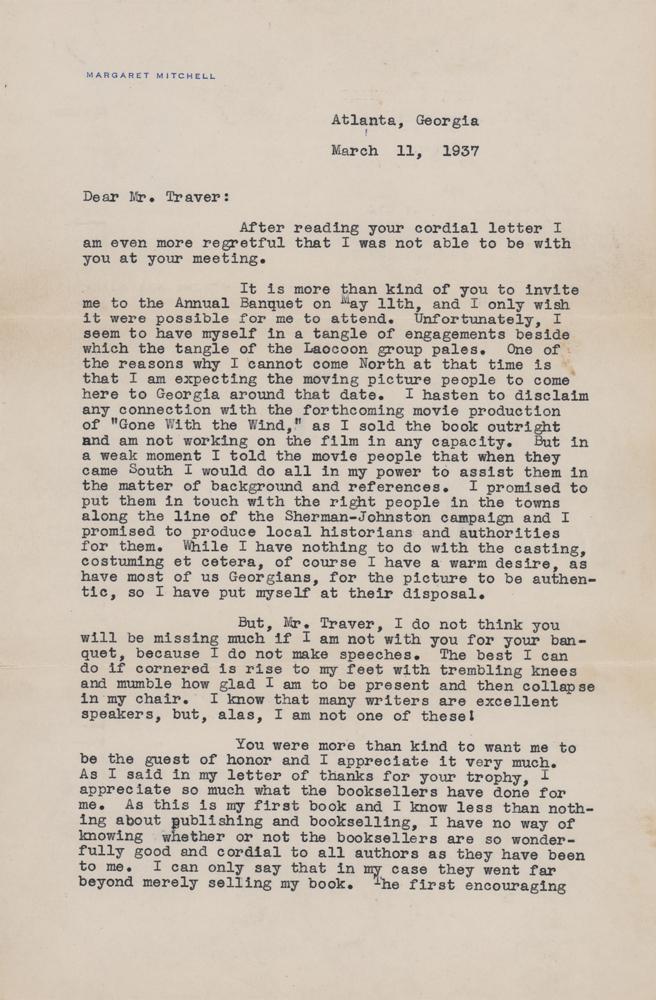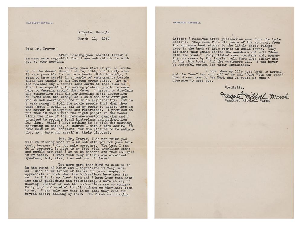 TLS signed “Margaret Mitchell Marsh,” two pages, 7 x 11, personal letterhead, March 11, 1937. Letter to Mr. Traver, in part: "It is more than kind of you to invite me to the Annual Banquet…I only wish it were possible for me to attend. Unfortunately, I seem to have myself in a tangle of engagements beside which the tangle of Laocoon group pales. One of the reasons why I cannot come North at that time is that I am expecting the moving picture people to come here to Georgia around that date. I hasten to disclaim any connection with the forthcoming movie production of 'Gone With the Wind,' as I sold the book outright and am not working on the film in any capacity. But in a weak moment I told the movie people that when they came South I would do all in my power to assist them in the matter of background and references. I promised to put them in touch with the right people in the towns along the line of the Sherman-Johnston campaign and I promised to produce local historians and authorities for them. While I have nothing to do with the casting, costuming et cetera, of course I have a warm desire, as have most of us Georgians, for the picture to be authentic, so I have put myself at their disposal.