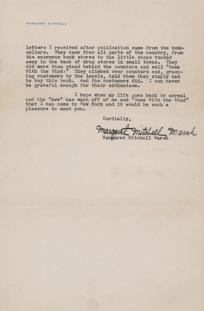 I appreciate so much what booksellers have done for me. As this is my first book and I know less than nothing about publishing and bookselling, I have no way of knowing whether or not the booksellers are so wonderfully good and cordial to all authors as they have been to me. I can only say that in my case they went far beyond merely selling my book. The first encouraging letters I received after publication came from the booksellers. They came from all parts of the country, from the enormous book stores to the little shops tucked away in the back of drug stores in small towns. They did more than stand behind the counters and sell 'Gone With the Wind.' They climbed over counters and, grasping customers by the lapels, told them they simply had to buy this book. And the customers did. I can never be grateful enough for their enthusiasm." In fine condition. Fantastic content from the celebrated Southern author, covering both the Gone With the Wind movie and its source material—Mitchell's novel was the top American fiction bestseller in 1936 and 1937, thanks, in part, to the enthusiasm of booksellers around the nation.