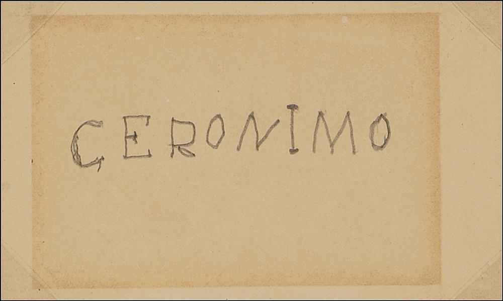 Chiricahua Apache (1829-1909) who attained legendary status for his steadfast defense of Native American lands against the United States government. After decades of aggressive resistance, Geronimo surrendered to General Nelson A. Miles at Skeleton Canyon, Arizona, on September 4, 1886. After years of imprisonment, followed by 'military confinement,' Geronimo became a celebrity, appearing at such venues as the 1904 World's Fair in St. Louis (where he sold autographs to curiosity seekers) and in Theodore Roosevelt's 1905 inaugural parade. Rare bold pencil signature, "Geronimo," in his distinctive block-printed hand, on an off-white 4 x 2.5 card. Archivally corner-mounted, matted, and framed with a portrait to an overall size of 10.75 x 15. In fine condition, with a uniform block of toning over signature. Geronimo's autograph stands among the most elusive and desirable of Old West signatures.