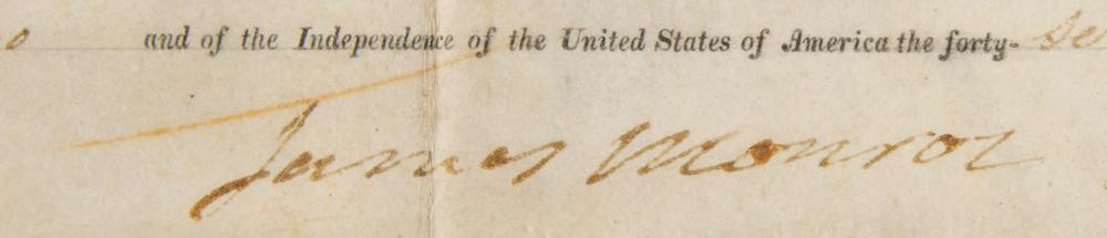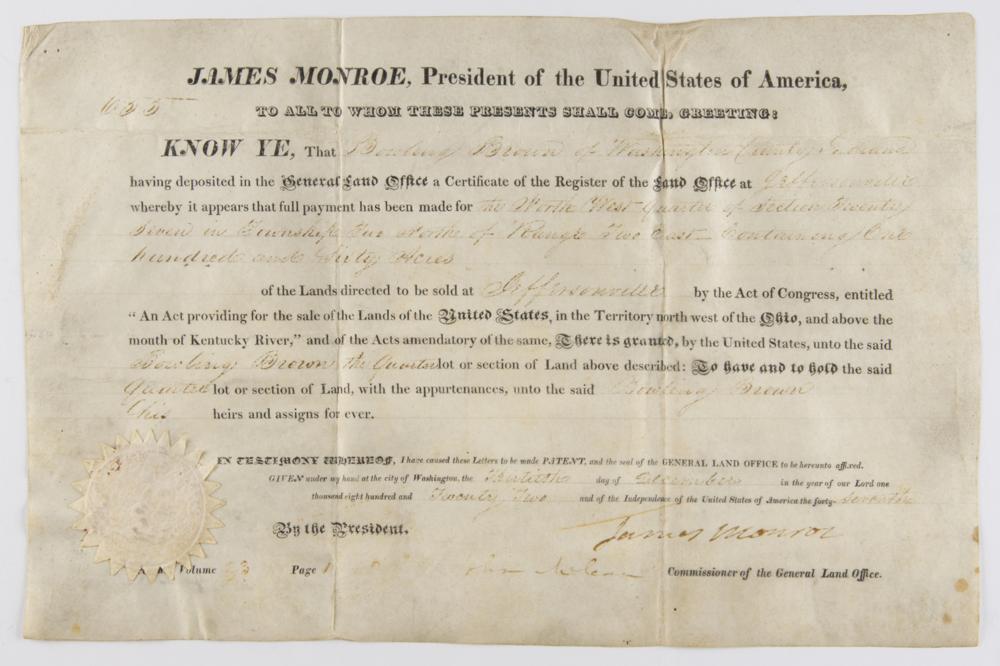 Partly-printed vellum DS as president, one page, 14 x 9.25, December 30, 1822. President Madison grants Bowling Brown a tract of land containing "One hundred and Sixty Acres…at Jeffersonville." Signed at the conclusion by President James Madison and countersigned by Commissioner of the General Land Office John McLean. The white paper seal affixed to the lower left remains intact. In fine condition, with light soiling, and slight fading to the handwritten portions of the document.