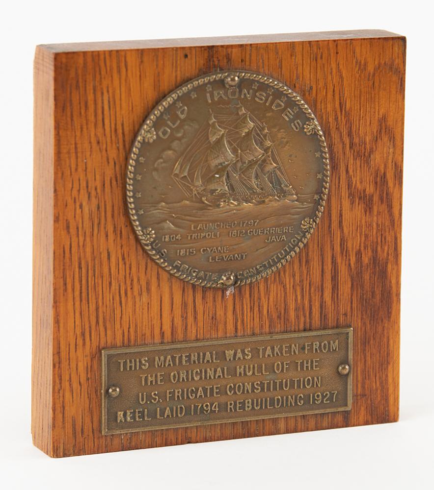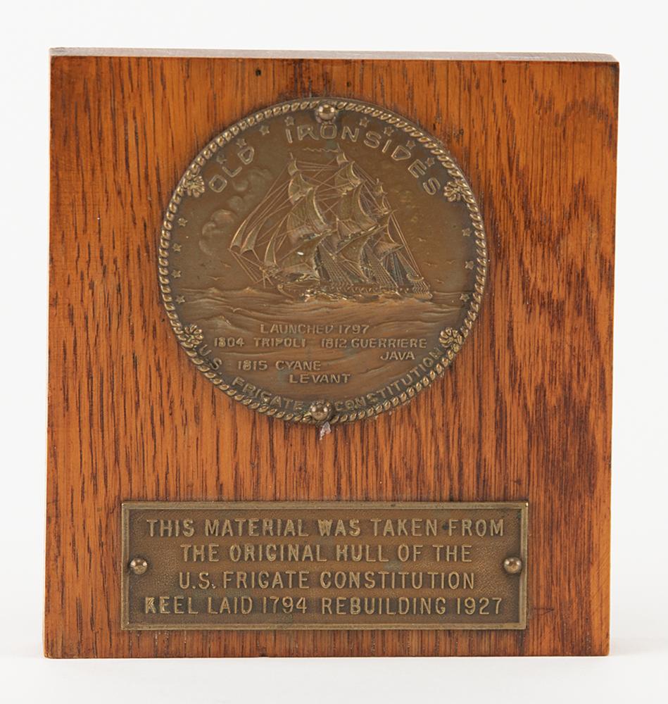 Block of wood removed from the hull of the USS Constitution during the frigate's historic 1927 restoration, measuring 4.25″ x 4.5″ x .75″, with the original bronze plate reading: "This material was taken from the original hull of the U.S. Frigate Constitution, Keel laid 1794, Rebuilding 1927." The block also bears a 2.5″ diameter bronze emblem with an embossed image of “Old Ironsides” with its sails up, with raised text below: "Launched 1797, 1804 Tripoli, 1812 Guerriere, Java, 1813 Cyane, Levant, U.S. Frigate Constitution." The reverse features a metal hanging loop. In fine condition. Untouched pieces of the original Constitution hull showing wear from years of service are the most desirable and scarce of the relic items from the 1927 restoration, given that most of the relics were repurposed souvenir items made from salvaged material. This example is untouched and displays wear sustained by the ship's hull.