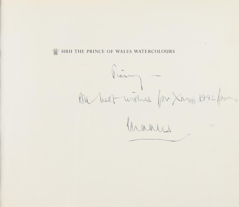 Signed book: HRH The Prince of Wales Watercolours. First edition. Boston: Little, Brown and Company, 1991. Hardcover with dust jacket, 11.5 x 9.5, 159 pages. Signed and inscribed on the half-title page in black ink to BBC TV and radio personality Sir Jimmy Savile, "Jimmy—All best wishes for Xmas 1992 from, Charles." In fine condition, with a couple of small smudges to the inscription, and some edgewear to the dust jacket.