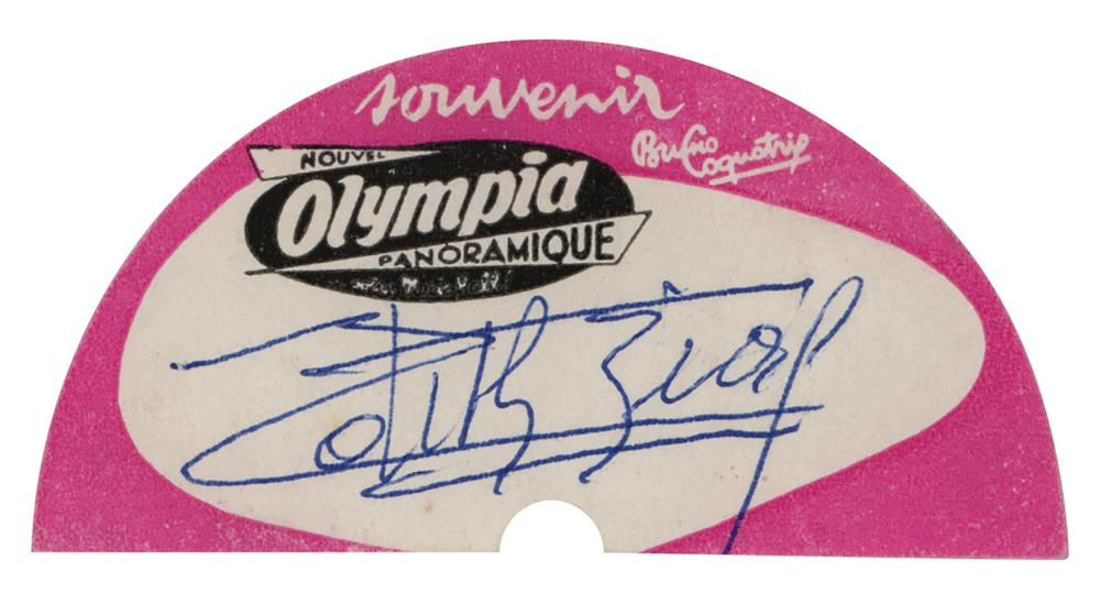 Vintage ballpoint signature, "Edith Piaf,” on a 3 x 1.5 souvenir record sticker from "Le Nouvel Olympia Panoramique." In fine condition.