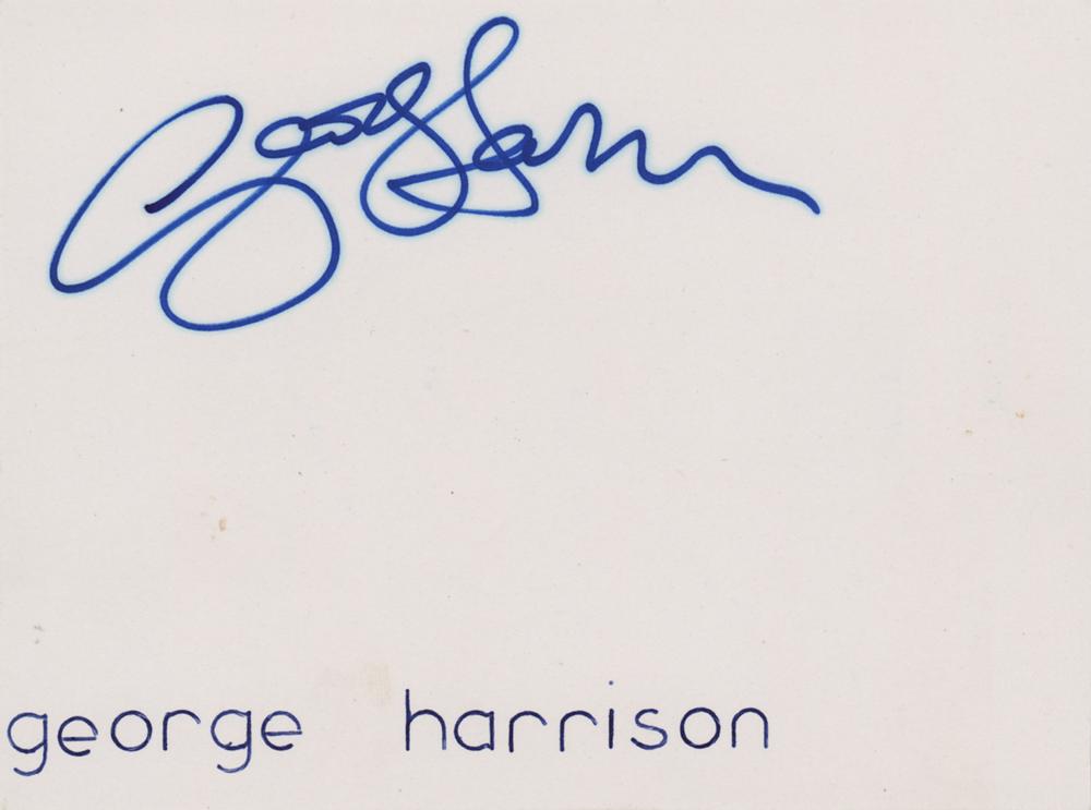Felt tip signature, "George Harrison,” on a white 5.25 x 4 card, neatly annotated with his name along the lower edge. In fine condition.