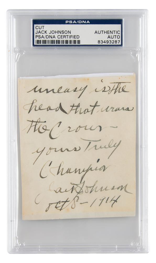 Terrific ink signature, "Uneasy is the head that wears the crown, yours truly, Champion, Jack Johnson, Oct. 8-1914,” on an off-white 3.5 x 4.25 sheet. In fine condition. Encapsulated in a PSA/DNA authentication holder. A true heavyweight signature made all the more desirable by Johnson's opening caveat, a phrase inspired by Shakespeare's play Henry IV, Part 2.