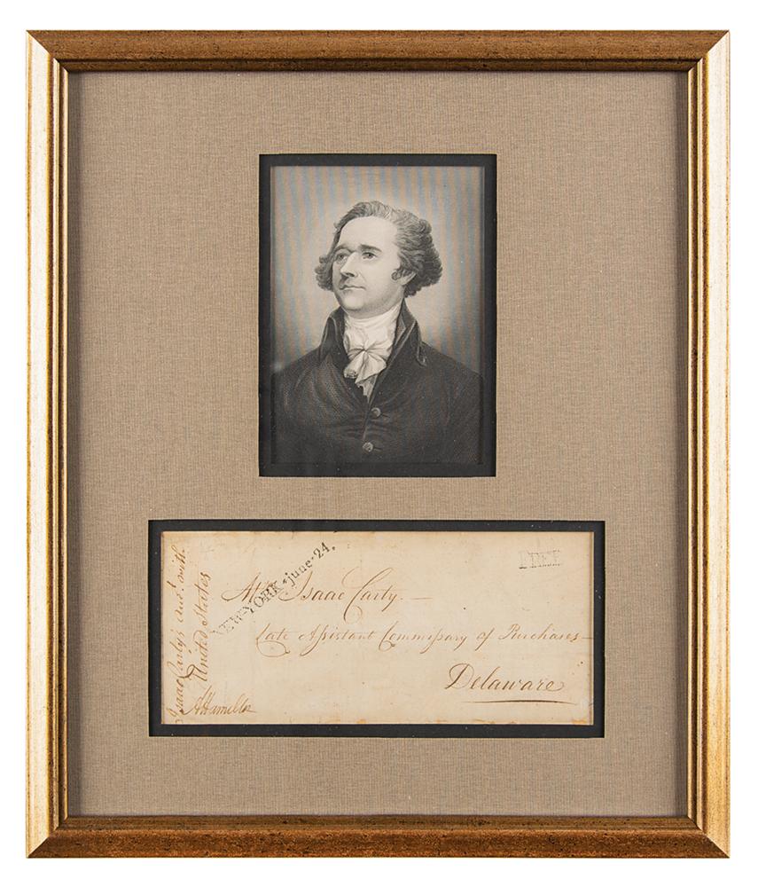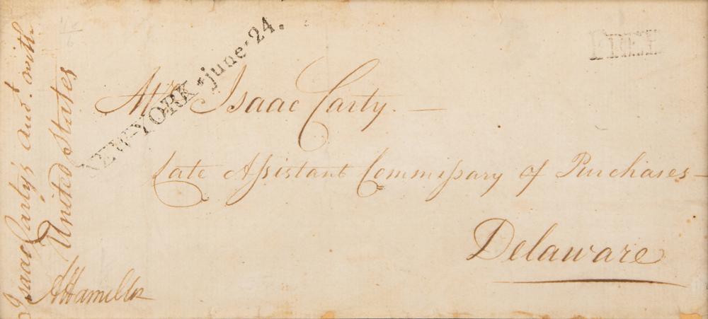 Free-franked mailing panel, 7.5 x 3.5, addressed in another hand to "Mr. Isaac Carty, Late Assistant Commissary of Purchases, Delaware," and franked in the lower left corner, "A. Hamilton." Postmarked "Free" at New York, June 24, [no year but circa 1789]. Archivally double-matted and framed with an engraved portrait to an overall size of 12.5 x 15. In fine condition, with light soiling. A Delaware officer, Isaac Carty served as Assistant Commissary of Purchases during the Revolutionary War.