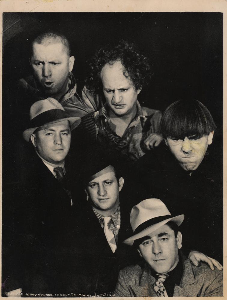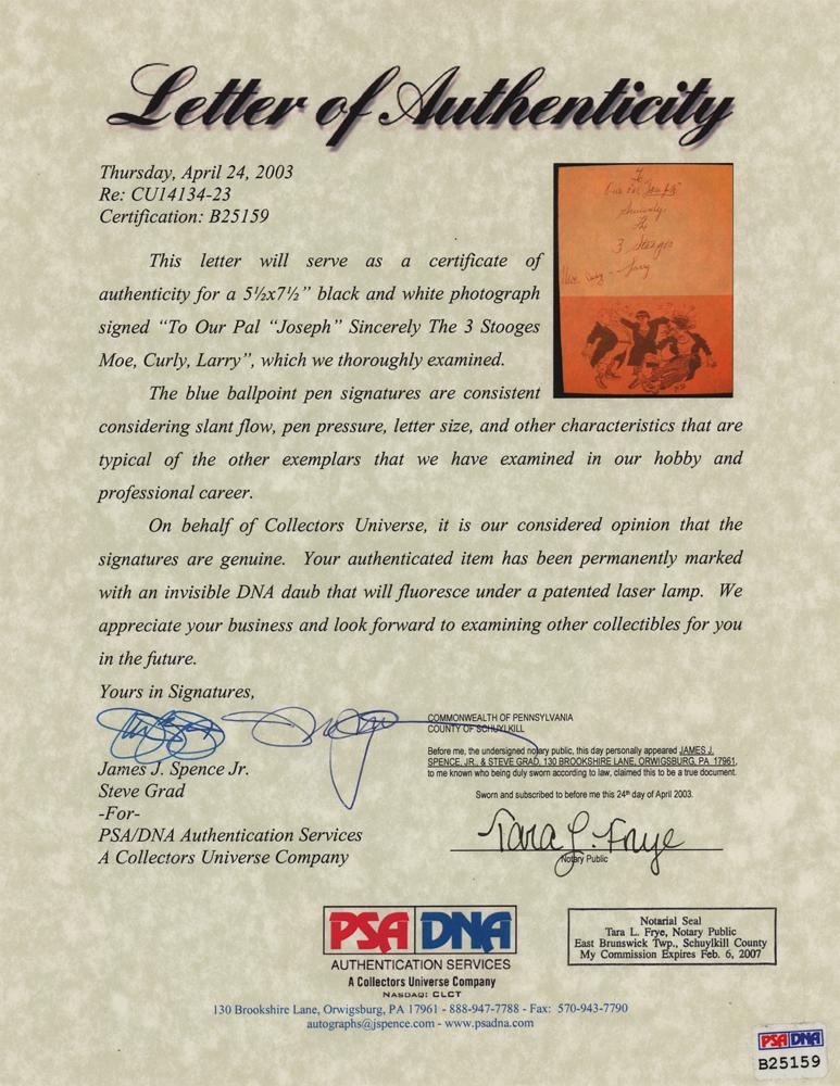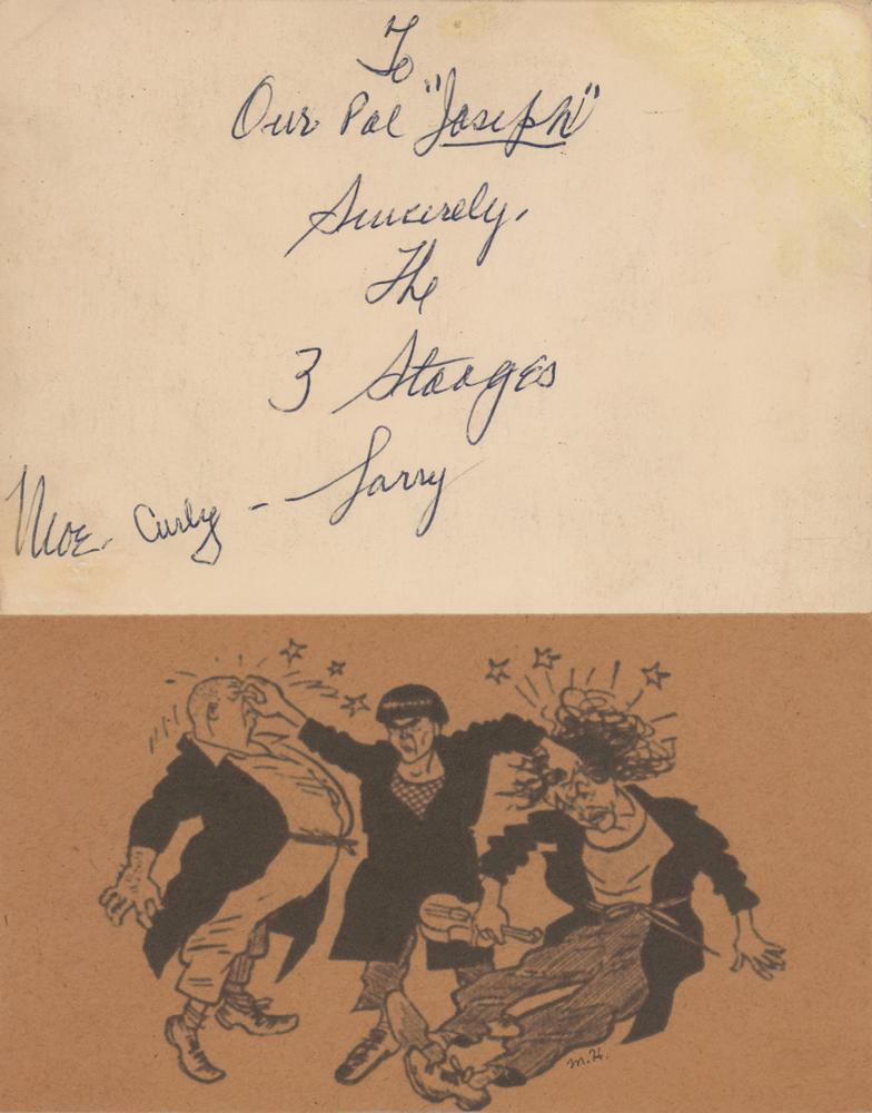 Vintage semi-glossy 5.5 x 7.5 promotional photo of the Three Stooges posing angrily above their dapperly dressed real-life selves, signed and inscribed on the reverse in ballpoint, “To Our Pal ‘Joseph,’ Sincerely, The 3 Stooges, Moe,” who signs on behalf of his fellow Stooges, “Curly - Larry.” A printed cartoon is affixed below the signature. In fine condition.